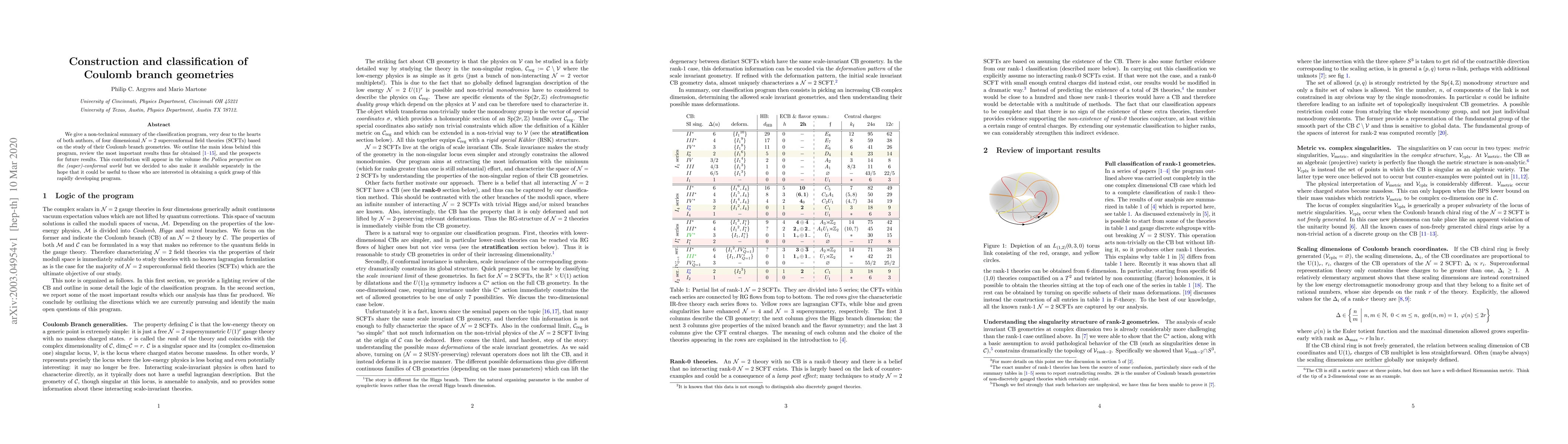 We give a non-technical summary of the classification program, very dear to the hearts of both authors, of four dimensional $\mathcal{N}=2$ superconformal field theories (SCFTs) based on the study of their Coulomb branch geometries. We outline the main ideas behind this program, review the most important results thus far obtained, and the prospects for future results. This contribution will appear in the volume "the Pollica perspective on the (super)-conformal world" but we decided to also make it available separately in the hope that it could be useful to those who are interested in obtaining a quick grasp of this rapidly developing program.