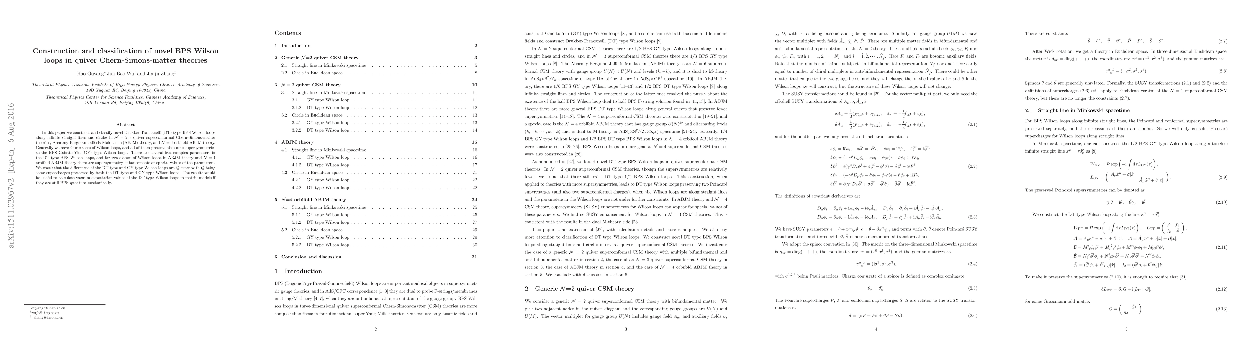In this paper we construct and classify novel Drukker-Trancanelli (DT) type BPS Wilson loops along infinite straight lines and circles in $\mathcal N=2,3$ quiver superconformal Chern-Simons-matter theories, Aharony-Bergman-Jafferis-Maldacena (ABJM) theory, and $\mathcal N=4$ orbifold ABJM theory. Generally we have four classes of Wilson loops, and all of them preserve the same supersymmetries as the BPS Gaiotto-Yin (GY) type Wilson loops. There are several free complex parameters in the DT type BPS Wilson loops, and for two classes of Wilson loops in ABJM theory and $\mathcal N=4$ orbifold ABJM theory there are supersymmetry enhancements at special values of the parameters. We check that the differences of the DT type and GY type Wilson loops are $Q$-exact with $Q$ being some supercharges preserved by both the DT type and GY type Wilson loops. The results would be useful to calculate vacuum expectation values of the DT type Wilson loops in matrix models if they are still BPS quantum mechanically.