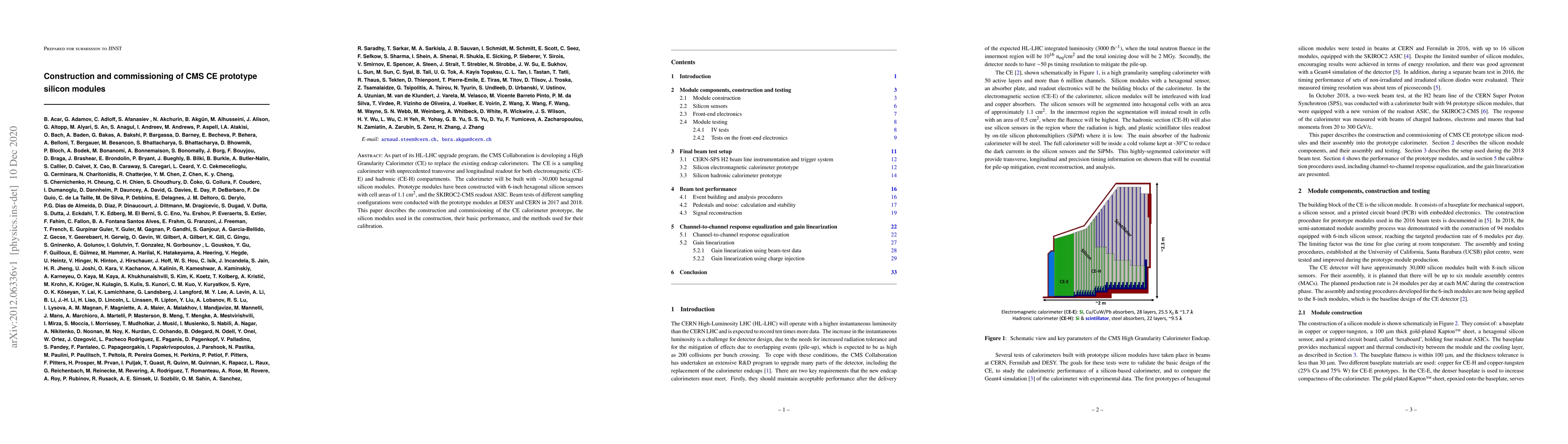 This paper details the construction and commissioning of the CMS High Granularity Calorimeter (CE) prototype, featuring silicon modules with hexagonal sensors and SKIROC2-CMS readout. It reports on the performance and calibration methods of these modules following beam tests conducted at DESY and CERN.