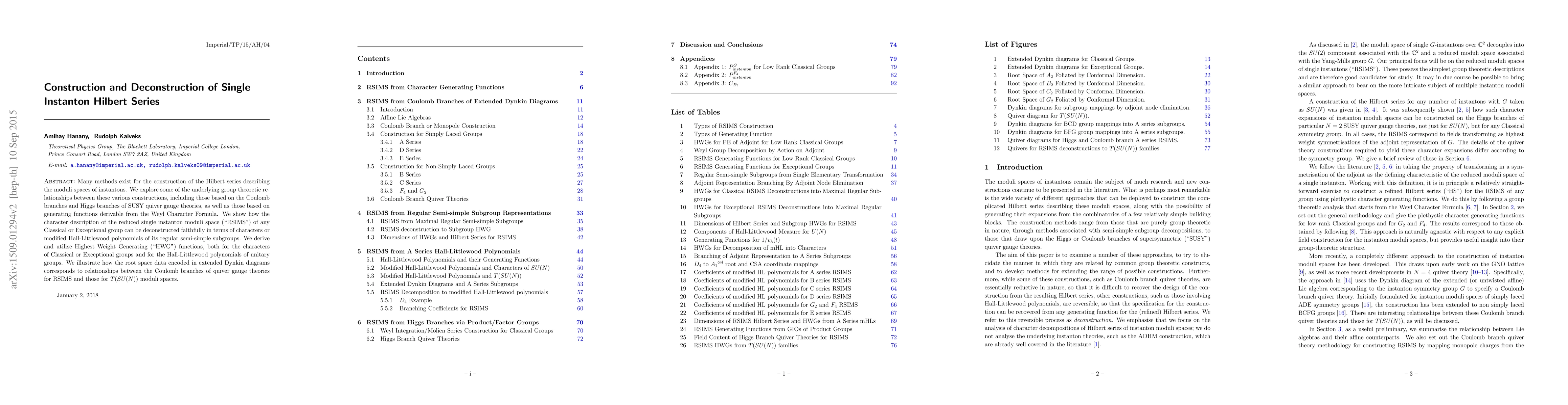 This paper investigates the construction and deconstruction of the Hilbert series for single instanton moduli spaces, exploring group theoretic relationships and employing methods from SUSY quiver gauge theories and Weyl Character Formula. It demonstrates how the character description of instanton moduli spaces can be deconstructed using Highest Weight Generating functions and modified Hall-Littlewood polynomials.