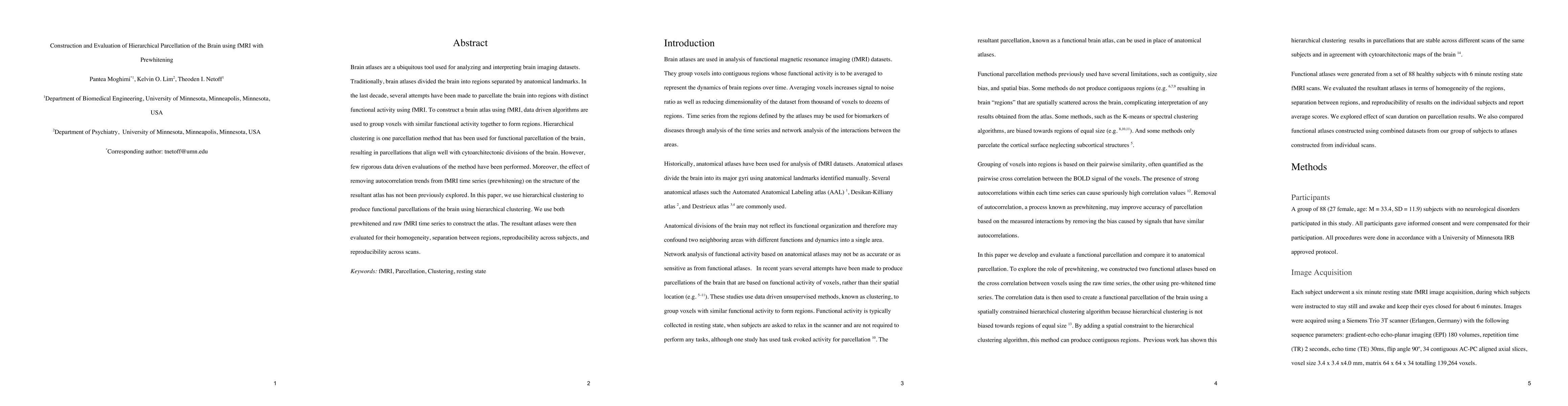 This paper constructs a functional brain atlas using hierarchical clustering on fMRI data, comparing prewhitened and raw time series. It evaluates the atlases based on homogeneity, regional separation, and reproducibility, aiming to assess the impact of prewhitening on parcellation outcomes.