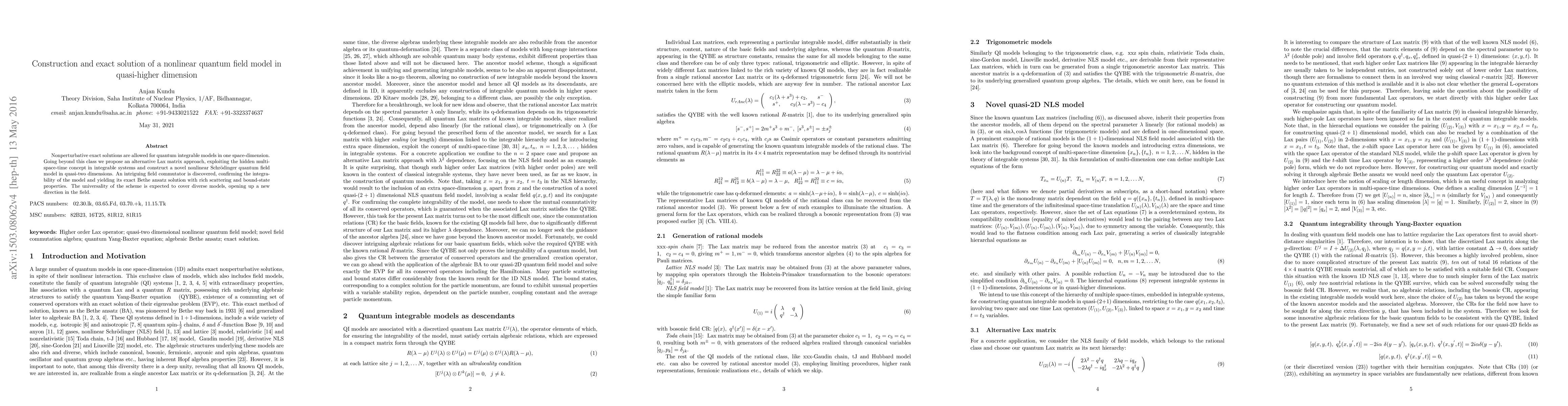 Nonperturbative exact solutions are allowed for quantum integrable models in one space-dimension. Going beyond this class we propose an alternative Lax matrix approach, exploiting the hidden multi-time concept in integrable systems and construct a novel quantum nonlinear Schroedinger model in quasi-two dimensions. An intriguing field commutator is discovered, confirming the integrability of the model and yielding its exact Bethe ansatz solution with rich scattering and bound-state properties. The universality of the scheme is expected to cover diverse models, opening up a new direction in the field.