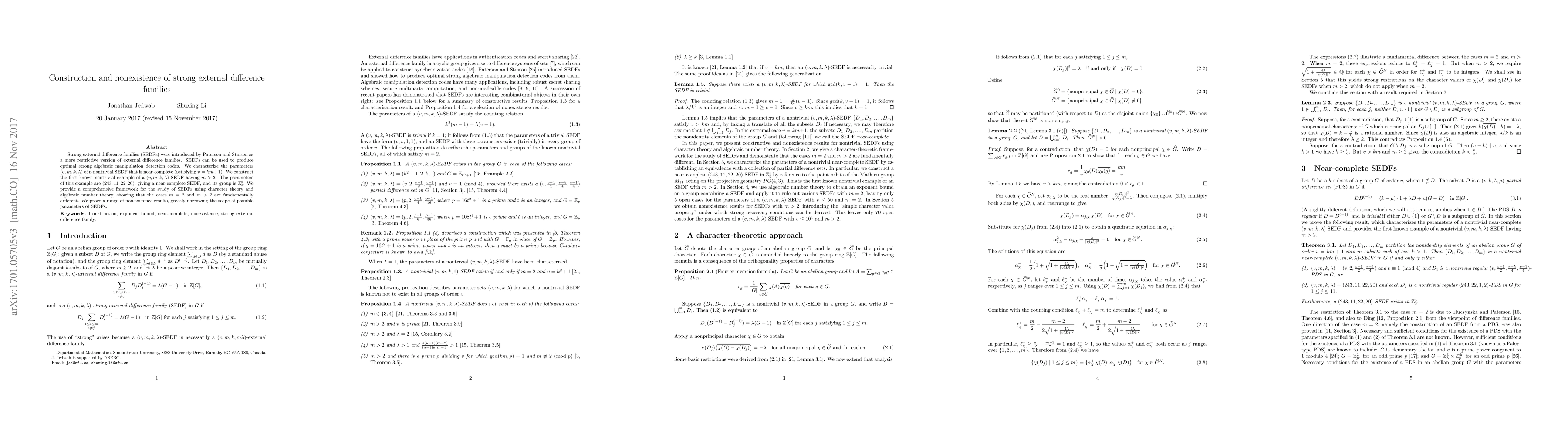 Strong external difference families (SEDFs) were introduced by Paterson and Stinson as a more restrictive version of external difference families. SEDFs can be used to produce optimal strong algebraic manipulation detection codes. We characterize the parameters $(v, m, k, \lambda)$ of a nontrivial SEDF that is near-complete (satisfying $v=km+1$). We construct the first known nontrivial example of a $(v, m, k, \lambda)$ SEDF having $m > 2$. The parameters of this example are $(243,11,22,20)$, giving a near-complete SEDF, and its group is $\mathbb{Z}_3^5$. We provide a comprehensive framework for the study of SEDFs using character theory and algebraic number theory, showing that the cases $m=2$ and $m>2$ are fundamentally different. We prove a range of nonexistence results, greatly narrowing the scope of possible parameters of SEDFs.