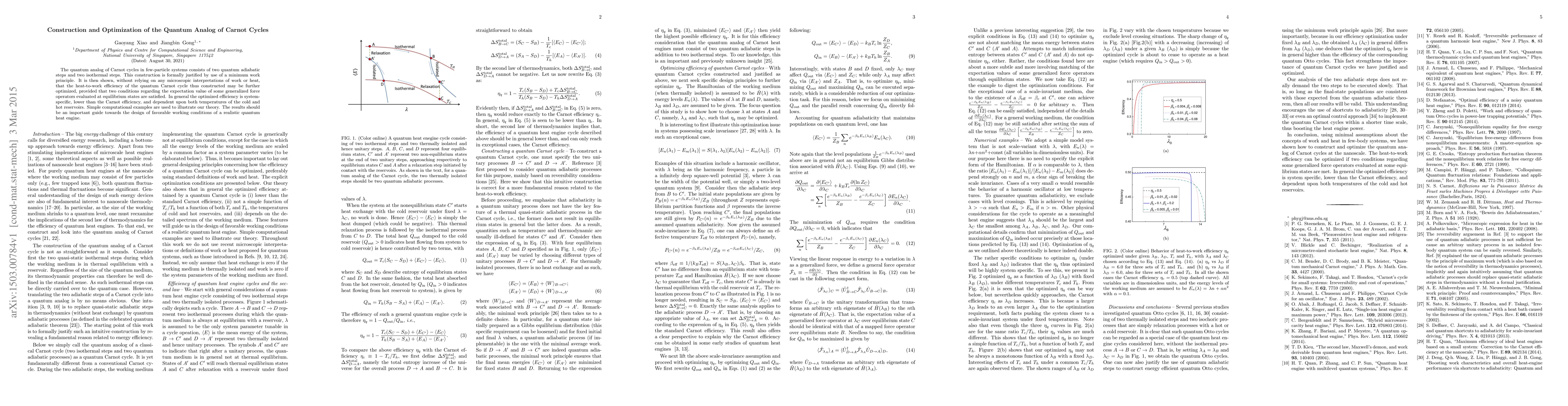 This paper presents a quantum version of Carnot cycles for few-particle systems, validated by a minimum work principle. It demonstrates that the cycle's efficiency can be optimized under specific conditions, which are system-dependent and lower than the Carnot efficiency. The findings offer guidance for designing practical quantum heat engines.