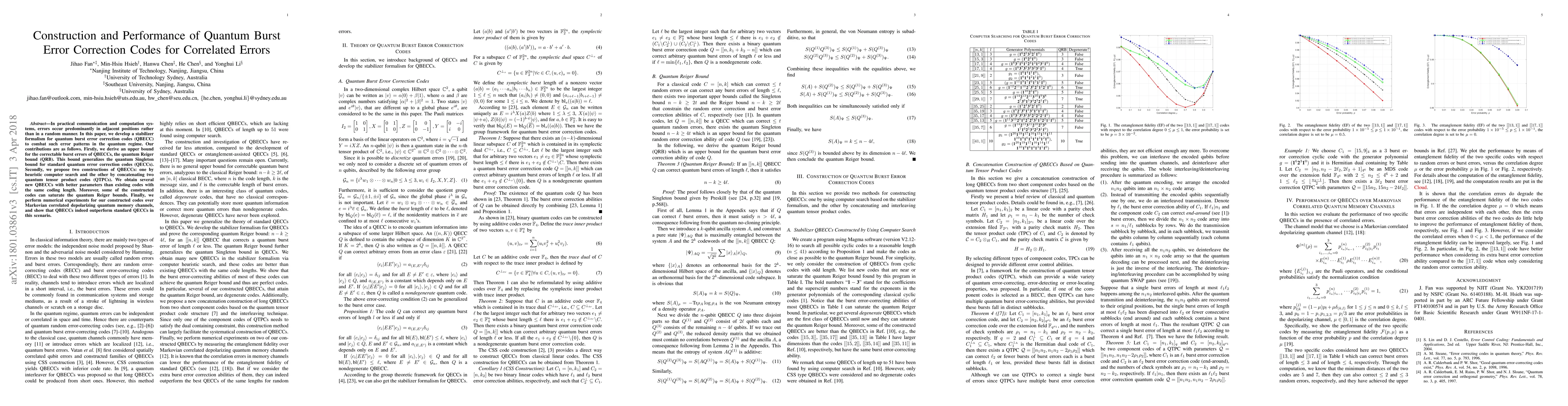 This paper develops quantum burst error correction codes (QBECC) using a stabilizer formalism to address correlated errors in adjacent positions. It introduces the quantum Reiger bound (QRB) and proposes two QBECC constructions, showing improved performance over standard quantum error correction codes (QECCs) in correlated error scenarios.