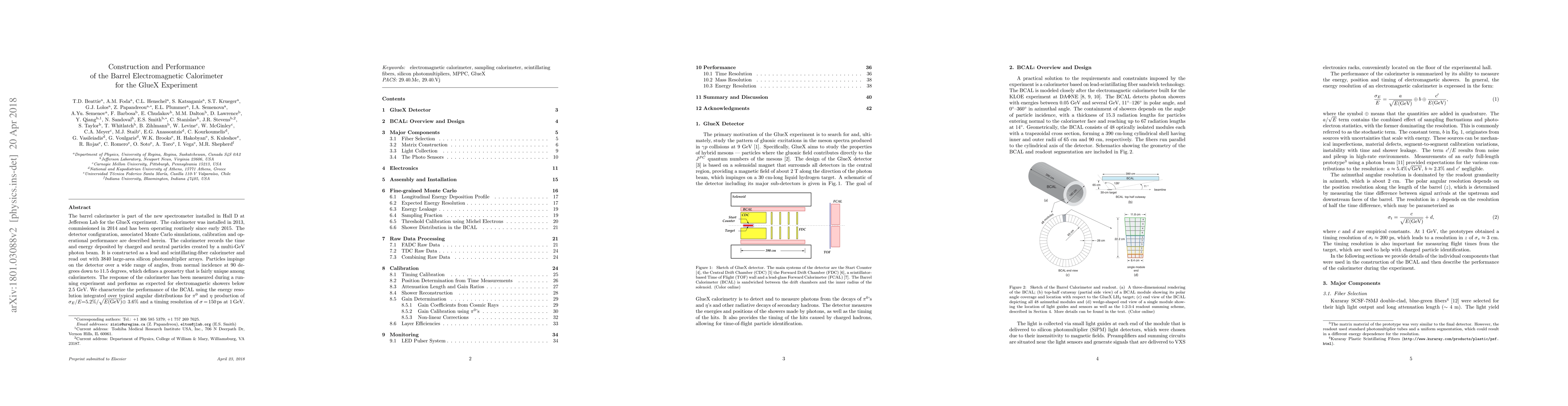 The barrel calorimeter is part of the new spectrometer installed in Hall D at Jefferson Lab for the GlueX experiment. The calorimeter was installed in 2013, commissioned in 2014 and has been operating routinely since early 2015. The detector configuration, associated Monte Carlo simulations, calibration and operational performance are described herein. The calorimeter records the time and energy deposited by charged and neutral particles created by a multi-GeV photon beam. It is constructed as a lead and scintillating-fiber calorimeter and read out with 3840 large-area silicon photomultiplier arrays. Particles impinge on the detector over a wide range of angles, from normal incidence at 90 degrees down to 11.5 degrees, which defines a geometry that is fairly unique among calorimeters. The response of the calorimeter has been measured during a running experiment and performs as expected for electromagnetic showers below 2.5 GeV. We characterize the performance of the BCAL using the energy resolution integrated over typical angular distributions for $\pi^0$ and $\eta$ production of $\sigma_E/E$=5.2\%/$\sqrt{E(\rm{GeV})} \oplus$ 3.6\% and a timing resolution of $\sigma$\,=\,150\,ps at 1\,GeV.