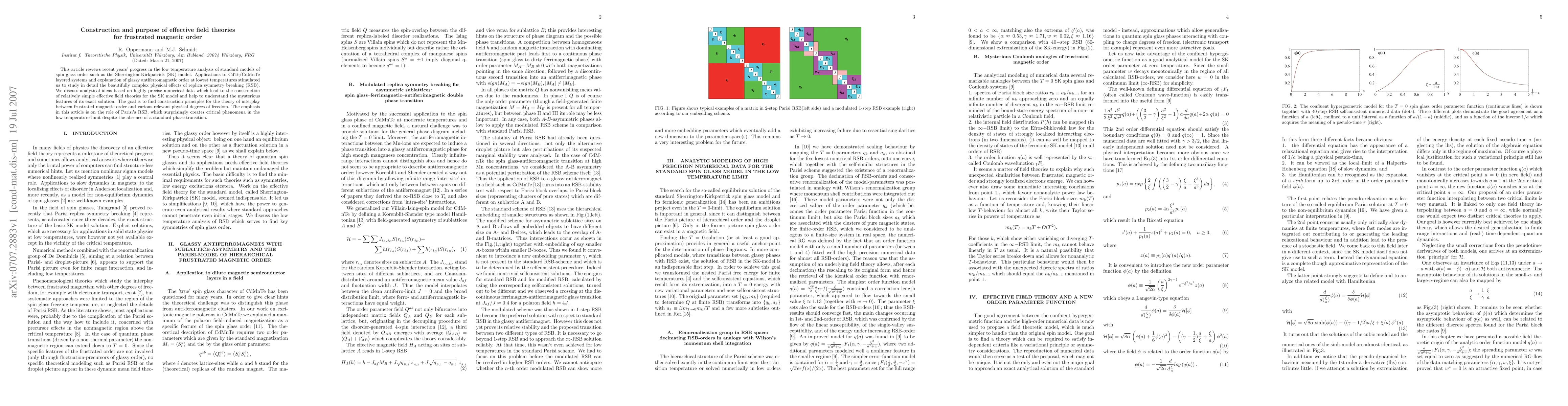 This article reviews recent years' progress in the low temperature analysis of standard models of spin glass order such as the Sherrington-Kirkpatrick (SK) model. Applications to CdTe/CdMnTe layered systems and explanation of glassy antiferromagnetic order at lowest temperatures stimulated us to study in detail the beautifully complex physical effects of replica symmetry breaking (RSB).We discuss analytical ideas based on highly precise numerical data which lead to the construction of relatively simple effective field theories for the SK model and help to understand the mysterious features of its exact solution. The goal is to find construction principles for the theory of interplay between frustrated magnetic order and various relevant physical degrees of freedom. The emphasis in this article is on the role of Parisi's RSB, which surprisingly creates critical phenomena in the low temperature limit despite the absence of a standard phase transition.
