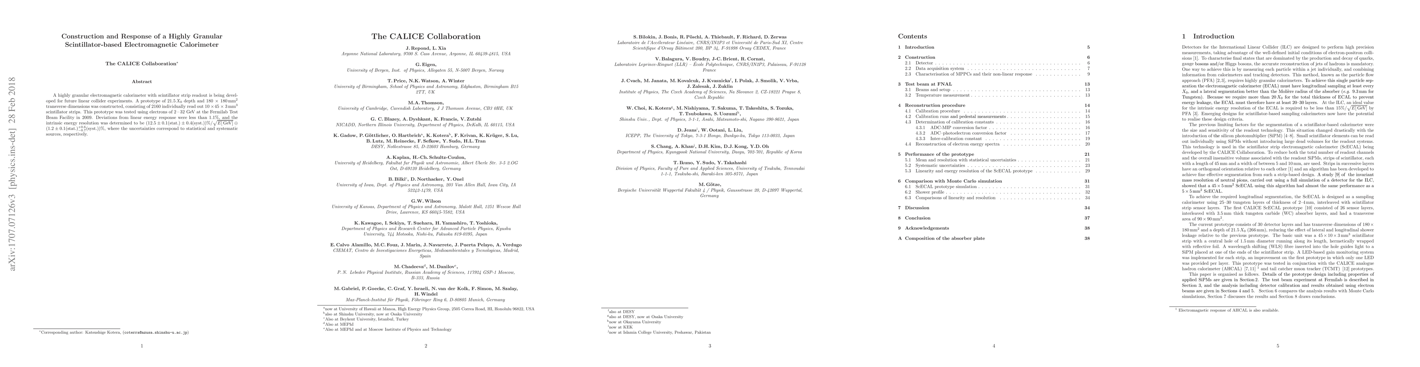 A prototype of a highly granular electromagnetic calorimeter using scintillator strips was developed and tested with electrons, showing less than 1.1% deviation from linear energy response and an energy resolution of $(12.5 \pm 0.1 (\mathrm{stat.}) \pm0.4 (\mathrm{syst.}))\%/\sqrt{E[\mathrm{GeV}]}$.