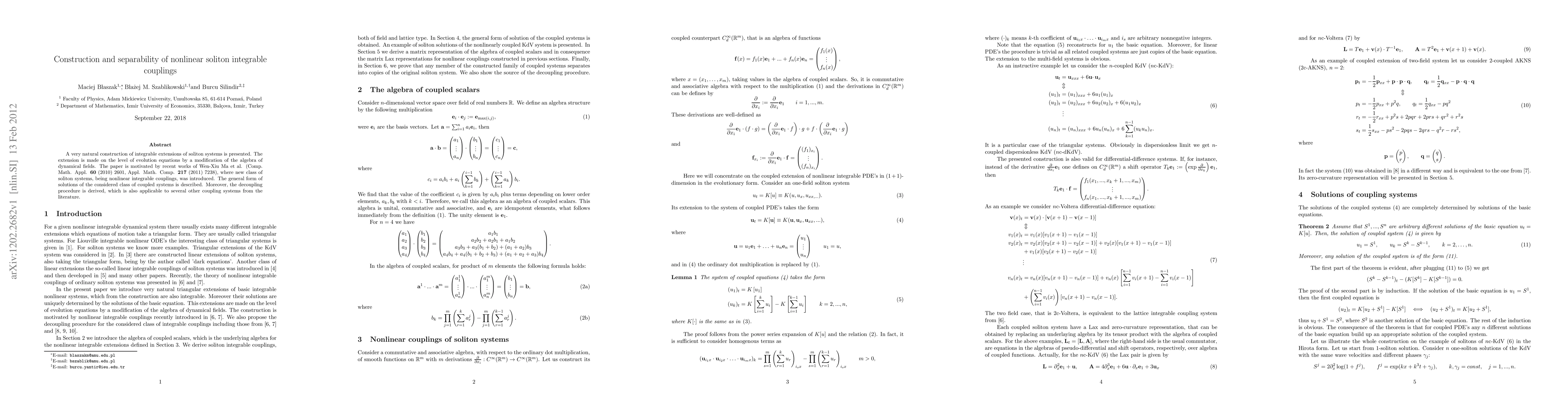 A very natural construction of integrable extensions of soliton systems is presented. The extension is made on the level of evolution equations by a modification of the algebra of dynamical fields. The paper is motivated by recent works of Wen-Xiu Ma et al. (Comp. Math. Appl. 60 (2010) 2601, Appl. Math. Comp. 217 (2011) 7238), where new class of soliton systems, being nonlinear integrable couplings, was introduced. The general form of solutions of the considered class of coupled systems is described. Moreover, the decoupling procedure is derived, which is also applicable to several other coupling systems from the literature.