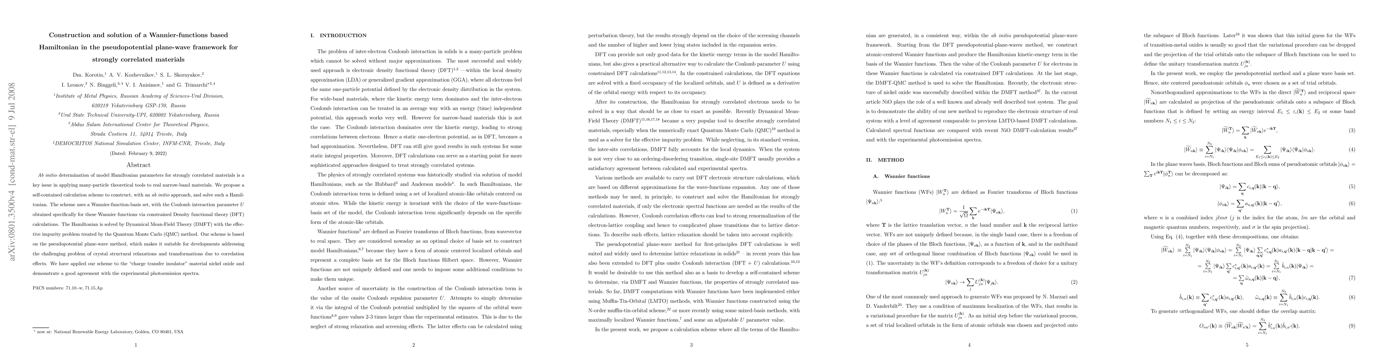 Ab initio determination of model Hamiltonian parameters for strongly correlated materials is a key issue in applying many-particle theoretical tools to real narrow-band materials. We propose a self-contained calculation scheme to construct, with an ab initio approach, and solve such a Hamiltonian. The scheme uses a Wannier-function-basis set, with the Coulomb interaction parameter U obtained specifically for these Wannier functions via constrained Density functional theory (DFT) calculations. The Hamiltonian is solved by Dynamical Mean-Field Theory (DMFT) with the effective impurity problem treated by the Quantum Monte Carlo (QMC) method. Our scheme is based on the pseudopotential plane-wave method, which makes it suitable for developments addressing the challenging problem of crystal structural relaxations and transformations due to correlation effects. We have applied our scheme to the "charge transfer insulator" material nickel oxide and demonstrate a good agreement with the experimental photoemission spectra.