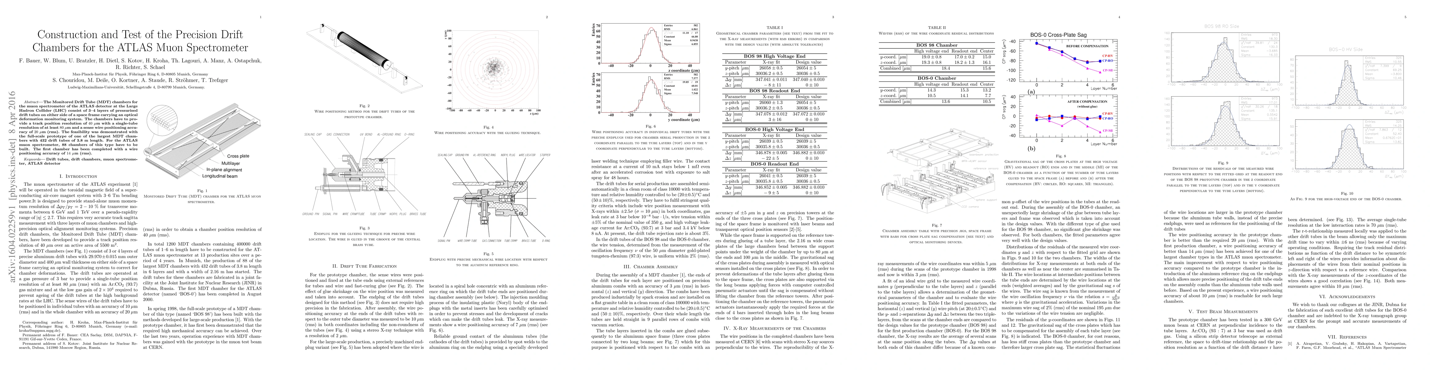 The paper details the construction and testing of precision Monitored Drift Tube (MDT) chambers for the ATLAS muon spectrometer at the LHC, achieving a track position resolution of 40 microns with a prototype chamber featuring 432 tubes. The first chamber has been completed with an exceptional wire positioning accuracy of 14 microns (rms).