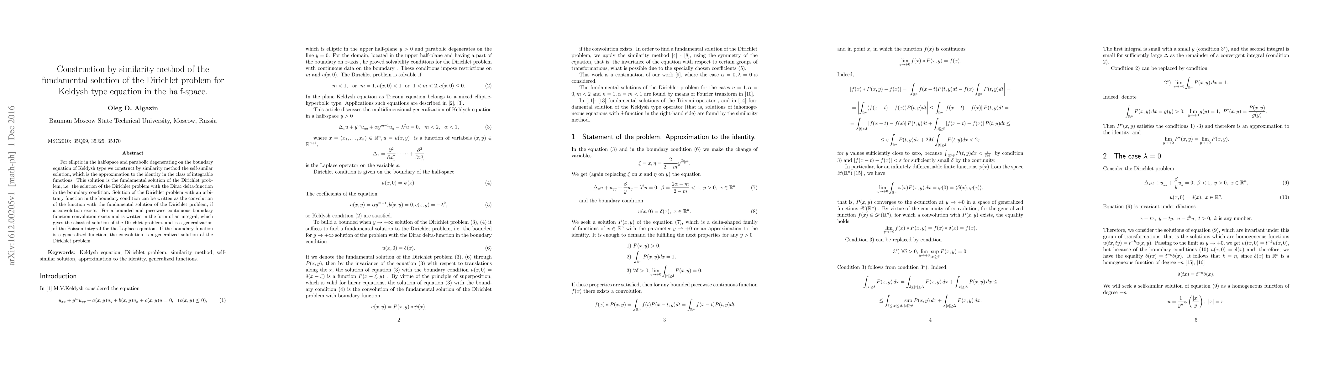 For elliptic in the half-space and parabolic degenerating on the boundary equation of Keldysh type we construct by similarity method the self-similar solution, which is the approximation to the identity in the class of integrable functions. This solution is the fundamental solution of the Dirichlet problem, i.e. the solution of the Dirichlet problem with the Dirac delta-function in the boundary condition. Solution of the Dirichlet problem with an arbitrary function in the boundary condition can be written as the convolution of the function with the fundamental solution of the Dirichlet problem, if a convolution exists. For a bounded and piecewise continuous boundary function convolution exists and is written in the form of an integral, which gives the classical solution of the Dirichlet problem, and is a generalization of the Poisson integral for the Laplace equation. If the boundary function is a generalized function, the convolution is a generalized solution of the Dirichlet problem.