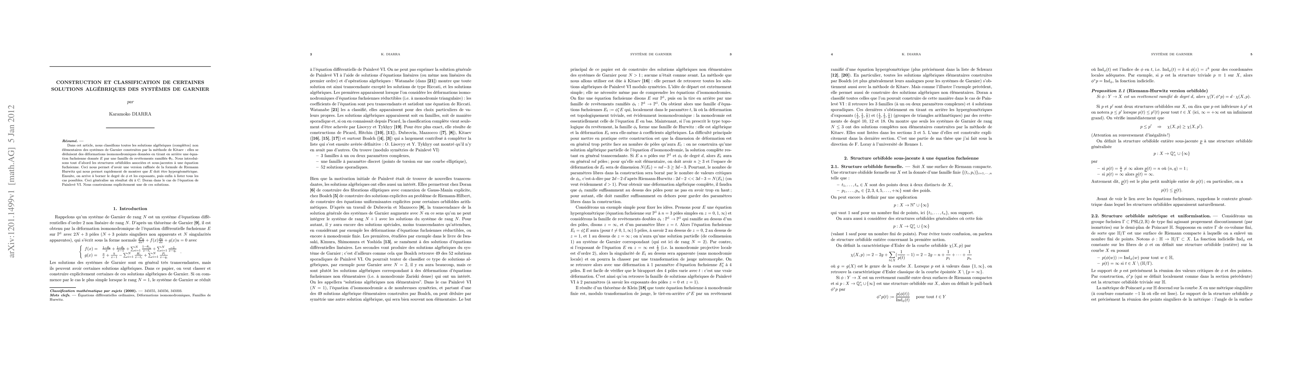 In this paper, we classify all (complete) non elementary algebraic solutions of Garnier systems that can be constructed by Kitaev's method: they are deduced from isomonodromic deformations defined by pulling back a given fuchsian equation E by a family of ramified covers. We first introduce orbifold structures associated to a fuchsian equation. This allow to get a refined version of Riemann-Hurwitz formula and then to promtly deduce that E is hypergeometric. Then, we can bound exponents and degree of the pull-back maps and further list all possible ramification cases. This generalizes a result due to C. Doran for the Painleve VI case. We explicitely construct one of these solutions.