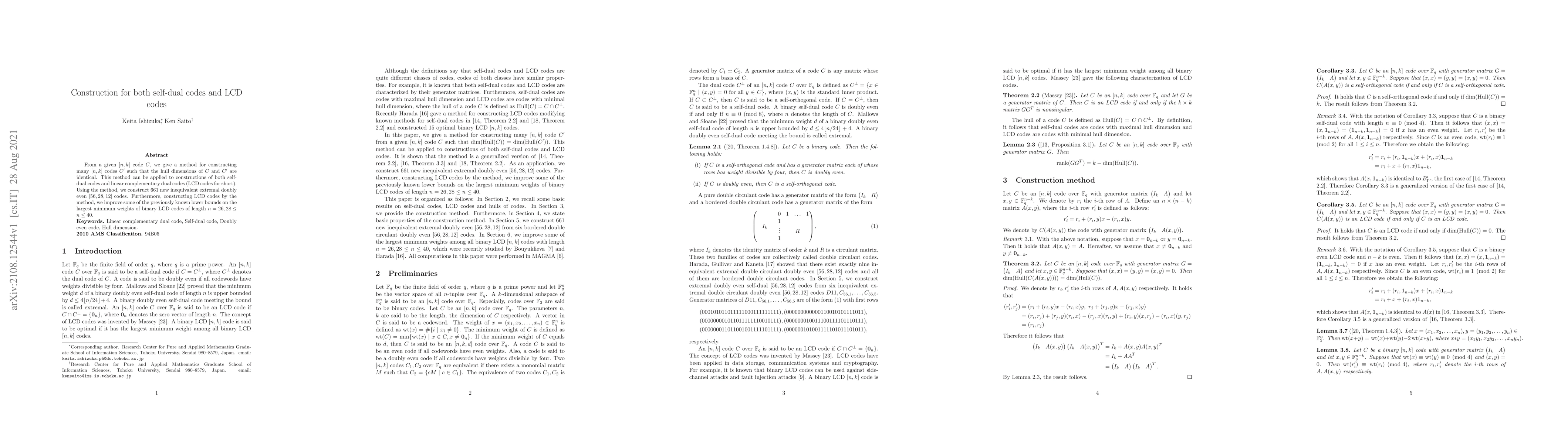 From a given $[n, k]$ code $C$, we give a method for constructing many $[n, k]$ codes $C'$ such that the hull dimensions of $C$ and $C'$ are identical. This method can be applied to constructions of both self-dual codes and linear complementary dual codes (LCD codes for short). Using the method, we construct 661 new inequivalent extremal doubly even $[56, 28, 12]$ codes. Furthermore, constructing LCD codes by the method, we improve some of the previously known lower bounds on the largest minimum weights of binary LCD codes of length $n=26,28 \le n \le 40$.