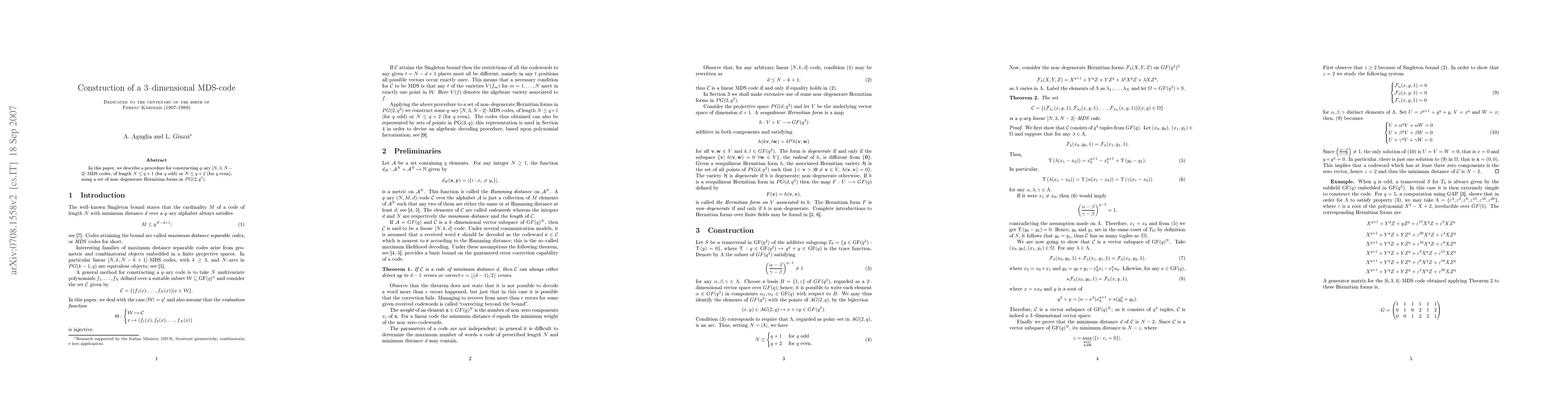 In this paper, we describe a procedure for constructing $q$--ary $[N,3,N-2]$--MDS codes, of length $N\leq q+1$ (for $q$ odd) or $N\leq q+2$ (for $q$ even), using a set of non--degenerate Hermitian forms in $PG(2,q^2)$.