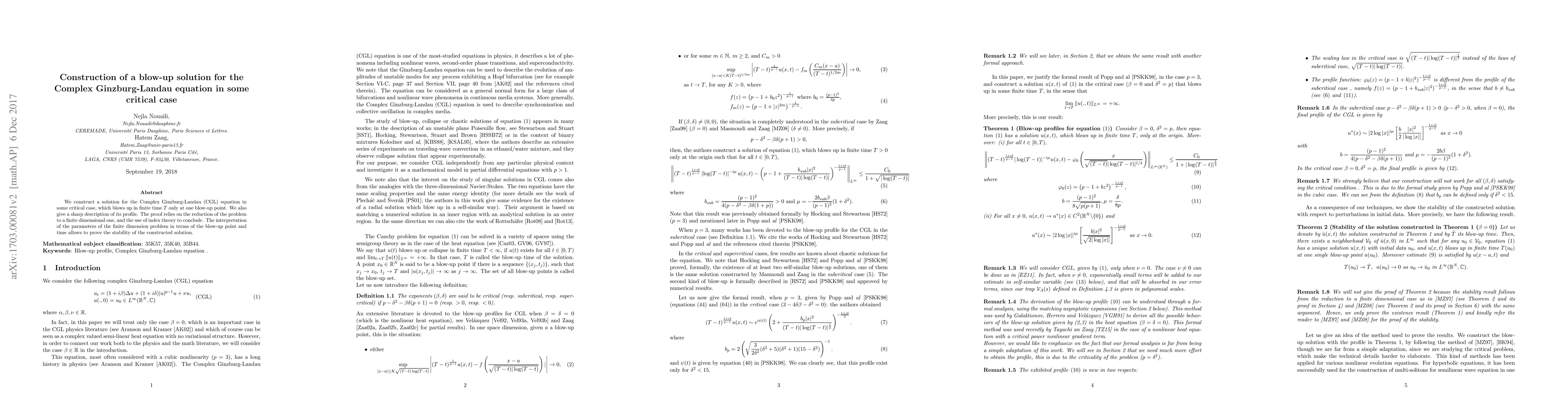 This paper constructs a finite-time blow-up solution for the Complex Ginzburg-Landau equation in a critical case, focusing on a single blow-up point. The proof employs a reduction to a finite-dimensional problem and index theory, ensuring the stability and precise profile of the solution.