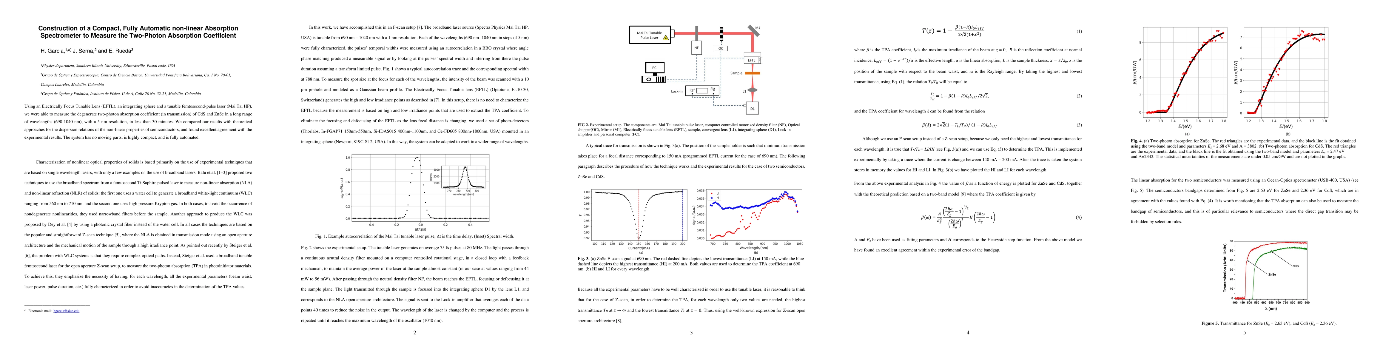 This paper describes the development of a compact, fully automatic spectrometer using an EFTL, integrating sphere, and tunable femtosecond-pulse laser to measure the two-photon absorption coefficient of CdS and ZnSe across a wavelength range of 690-1040 nm. The results show excellent agreement with theoretical models and demonstrate the system's efficiency and automation.