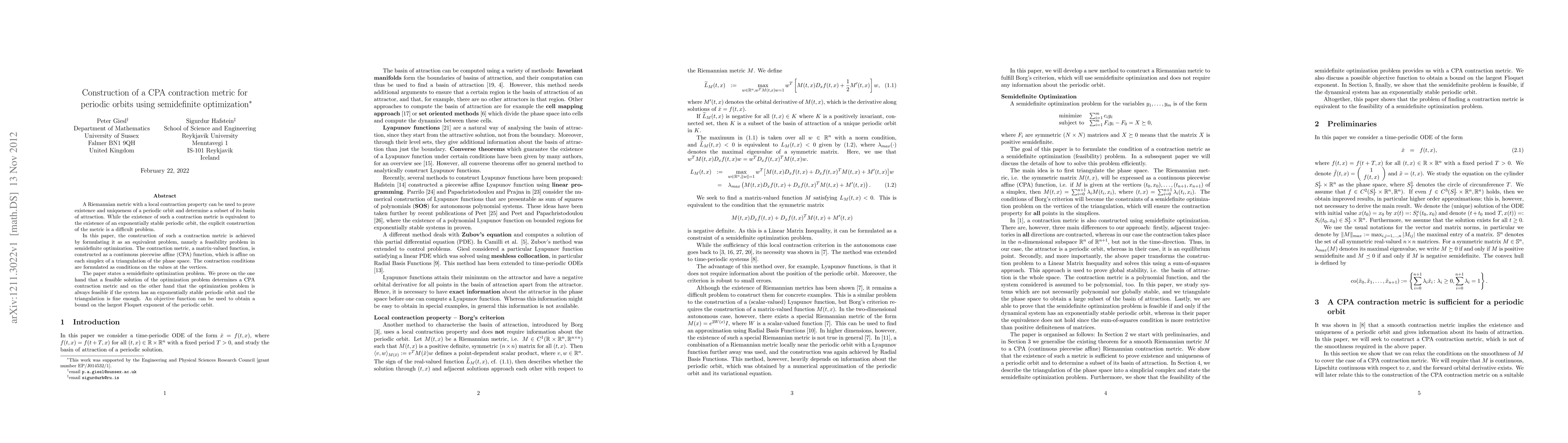 A Riemannian metric with a local contraction property can be used to prove existence and uniqueness of a periodic orbit and determine a subset of its basin of attraction. While the existence of such a contraction metric is equivalent to the existence of an exponentially stable periodic orbit, the explicit construction of the metric is a difficult problem. In this paper, the construction of such a contraction metric is achieved by formulating it as an equivalent problem, namely a feasibility problem in semidefinite optimization. The contraction metric, a matrix-valued function, is constructed as a continuous piecewise affine (CPA) function, which is affine on each simplex of a triangulation of the phase space. The contraction conditions are formulated as conditions on the values at the vertices. The paper states a semidefinite optimization problem. We prove on the one hand that a feasible solution of the optimization problem determines a CPA contraction metric and on the other hand that the optimization problem is always feasible if the system has an exponentially stable periodic orbit and the triangulation is fine enough. An objective function can be used to obtain a bound on the largest Floquet exponent of the periodic orbit.
