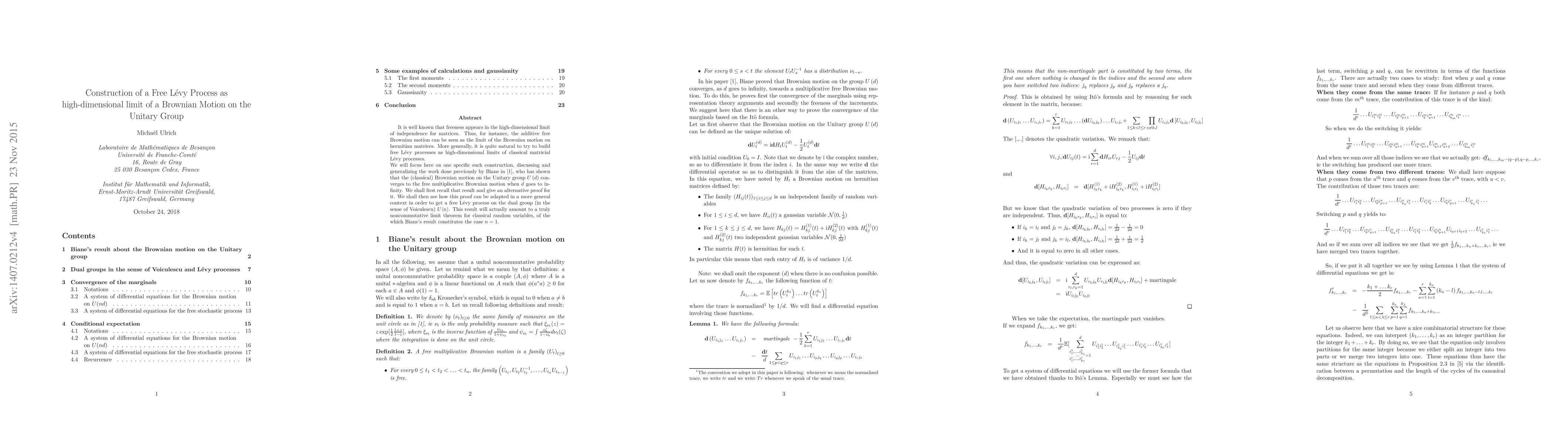 It is well known that freeness appears in the high-dimensional limit of independence for matrices. Thus, for instance, the additive free Brownian motion can be seen as the limit of the Brownian motion on hermitian matrices. More generally, it is quite natural to try to build free L\'evy processes as high-dimensional limits of classical matricial L\'evy processes. We will focus here on one specific such construction, discussing and generalizing a work done previously by Biane, who has shown that the (classical) Brownian motion on the Unitary group U\left(d\right) converges to the free multiplicative Brownian motion when d goes to infinity. We shall first recall that result and give an alternative proof for it. We shall then see how this proof can be adapted in a more general context in order to get a free L\'evy process on the dual group (in the sense of Voiculescu) U\langle n\rangle. This result will actually amount to a truly noncommutative limit theorem for classical random variables, of the which Biane's result constitutes the case n=1.