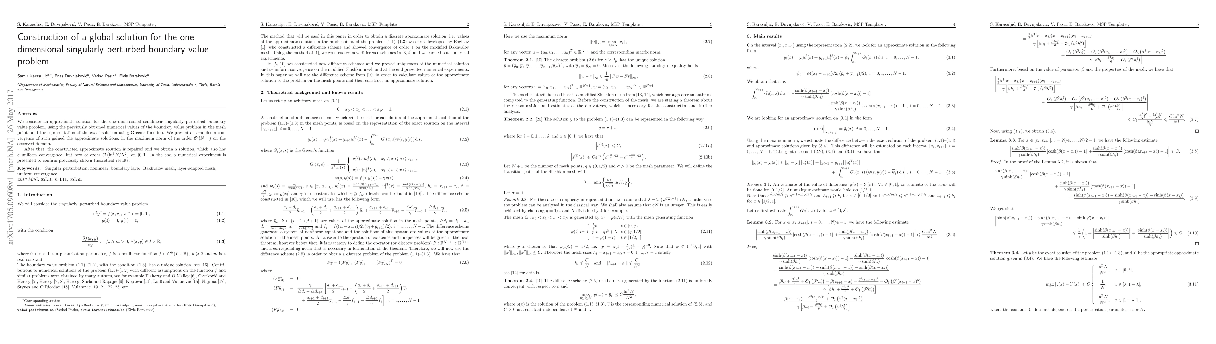 This paper constructs an approximate solution for a one-dimensional singularly-perturbed boundary value problem using numerical values and Green's function, achieving $\varepsilon$-uniform convergence of $\mathcal{O}(N^{-1})$. After refining the solution, it demonstrates improved $\varepsilon$-uniform convergence of $\mathcal{O}(\ln^2N/N^2)$ on $[0,1]$, confirmed by a numerical experiment.