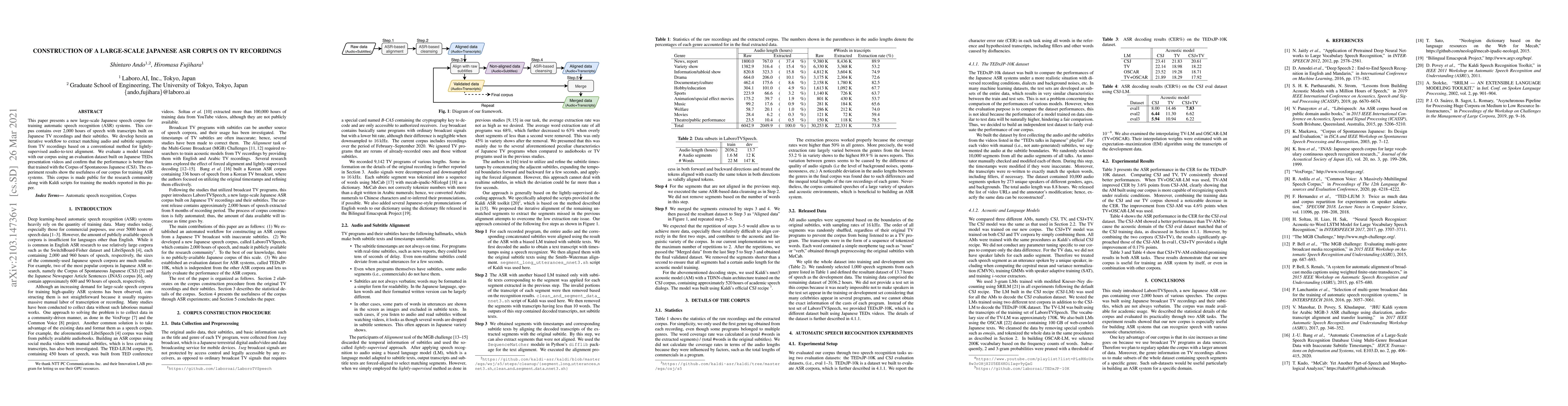 This paper constructs a large-scale Japanese ASR corpus from TV recordings, containing over 2,000 hours of speech and subtitles, and demonstrates its effectiveness by showing improved performance over the CSJ corpus in ASR model evaluations. The corpus and training scripts are made publicly available.
