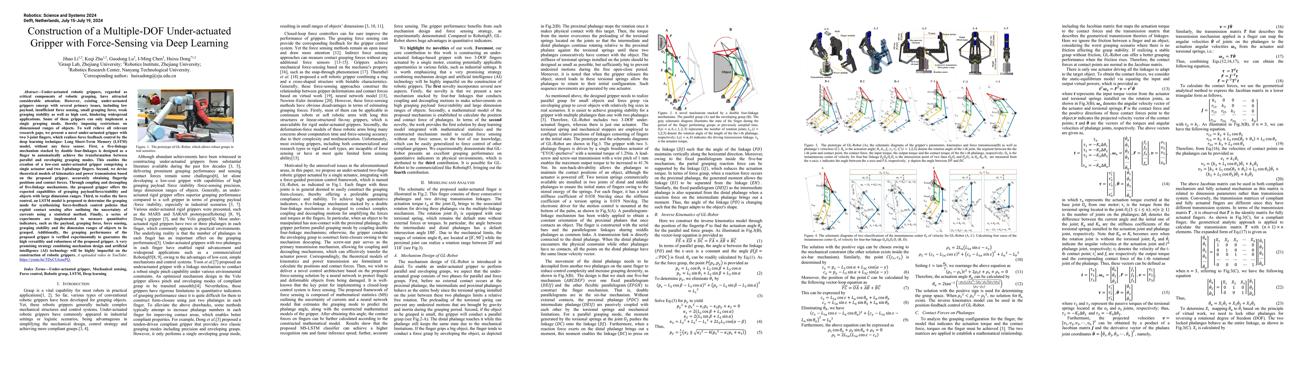 We present a novel under-actuated gripper with two 3-joint fingers, which realizes force feedback control by the deep learning technique- Long Short-Term Memory (LSTM) model, without any force sensor. First, a five-linkage mechanism stacked by double four-linkages is designed as a finger to automatically achieve the transformation between parallel and enveloping grasping modes. This enables the creation of a low-cost under-actuated gripper comprising a single actuator and two 3-phalange fingers. Second, we devise theoretical models of kinematics and power transmission based on the proposed gripper, accurately obtaining fingertip positions and contact forces. Through coupling and decoupling of five-linkage mechanisms, the proposed gripper offers the expected capabilities of grasping payload/force/stability and objects with large dimension ranges. Third, to realize the force control, an LSTM model is proposed to determine the grasping mode for synthesizing force-feedback control policies that exploit contact sensing after outlining the uncertainty of currents using a statistical method. Finally, a series of experiments are implemented to measure quantitative indicators, such as the payload, grasping force, force sensing, grasping stability and the dimension ranges of objects to be grasped. Additionally, the grasping performance of the proposed gripper is verified experimentally to guarantee the high versatility and robustness of the proposed gripper.