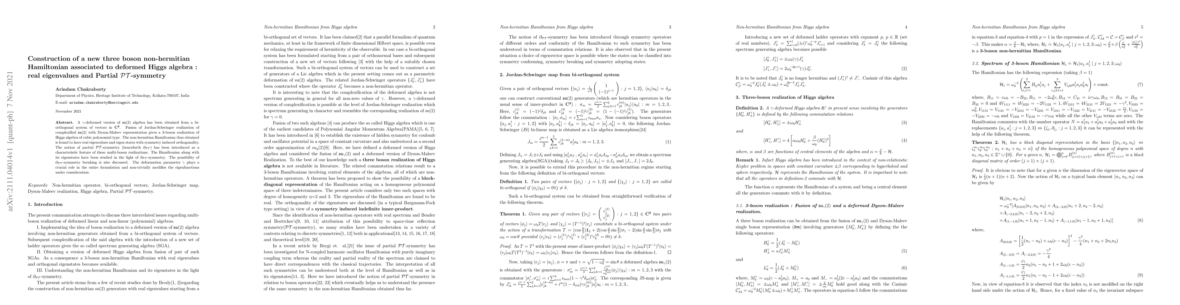 A $\gamma$-deformed version of $\mathfrak{su}(2)$ algebra has been obtained from a bi-orthogonal system of vectors in $\bf{C^2}$. Fusion of Jordan-Schwinger realization of complexified $\mathfrak{su}(2)$ with Dyson-Maleev representation gives a 3-boson realization of Higgs algebra of cubic polynomial type. The non-hermitian Hamiltonian thus obtained is found to have real eigenvalues and eigen states with symmetry induced orthogonality. The notion of partial ${\mathcal {PT}}$-symmetry (henceforth $\partial_{\mathcal { PT}}$) has been introduced as a characteristic feature of these multi-boson realizations. The Hamiltonian along with its eigenstates have been studied in the light of $\partial_{\mathcal { PT}}$-symmetry. The possibility of $\partial_{\mathcal { PT}}$-symmetry breaking is also discussed. The deformation parameter $\gamma$ plays a crucial role in the entire formulation and non-trivially modifies the eigenfunctions under consideration.