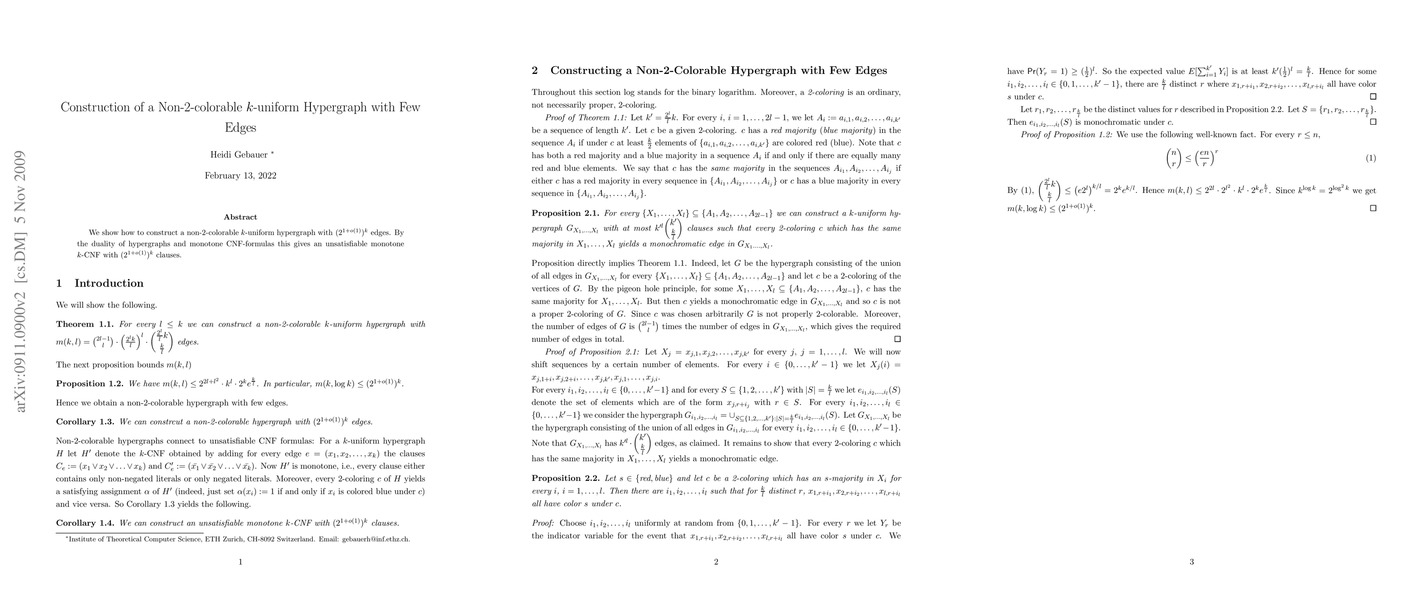 This paper constructs a non-2-colorable k-uniform hypergraph with a minimal number of edges, specifically (2^(1 + o(1)))^k edges, demonstrating the duality with unsatisfiable monotone k-CNF formulas containing (2^(1 + o(1)))^k clauses.