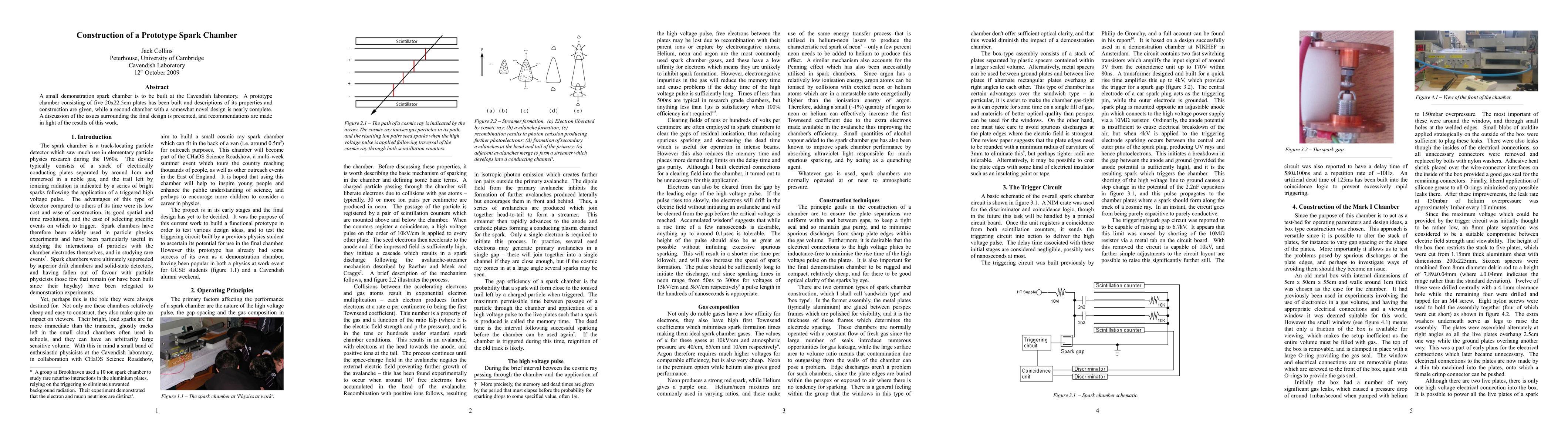 The paper details the construction of a small spark chamber prototype at the Cavendish Laboratory, comprising five 20x22.5cm plates. It also discusses a nearly complete second chamber with a unique design, along with design challenges and recommendations.