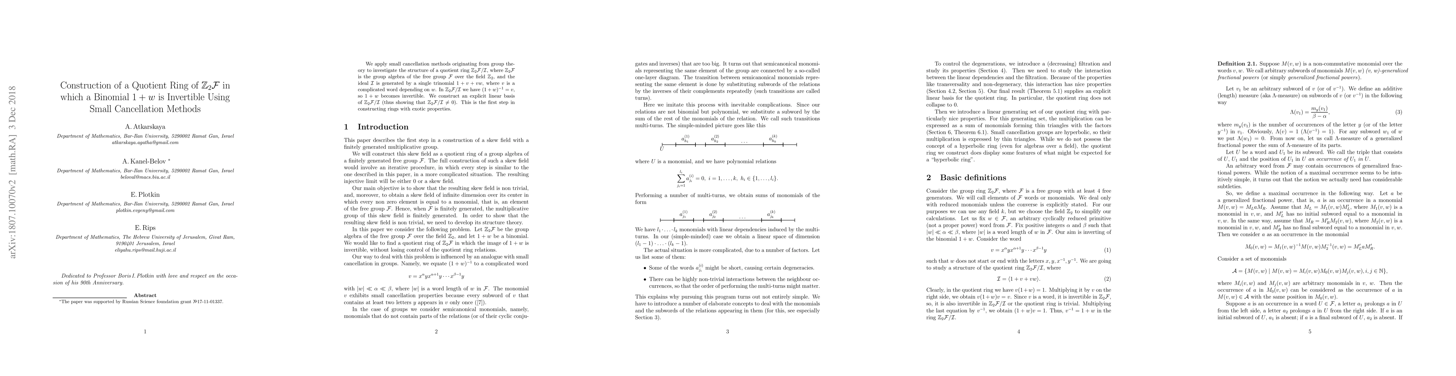 This paper uses small cancellation methods to analyze the structure of the quotient ring $\mathbb{Z}_2\mathcal{F} / \mathcal{I}$, where $\mathbb{Z}_2\mathcal{F}$ is the group algebra of a free group over $\mathbb{Z}_2$. It constructs an explicit linear basis showing that the ring is non-trivial and that $1 + w$ is invertible.