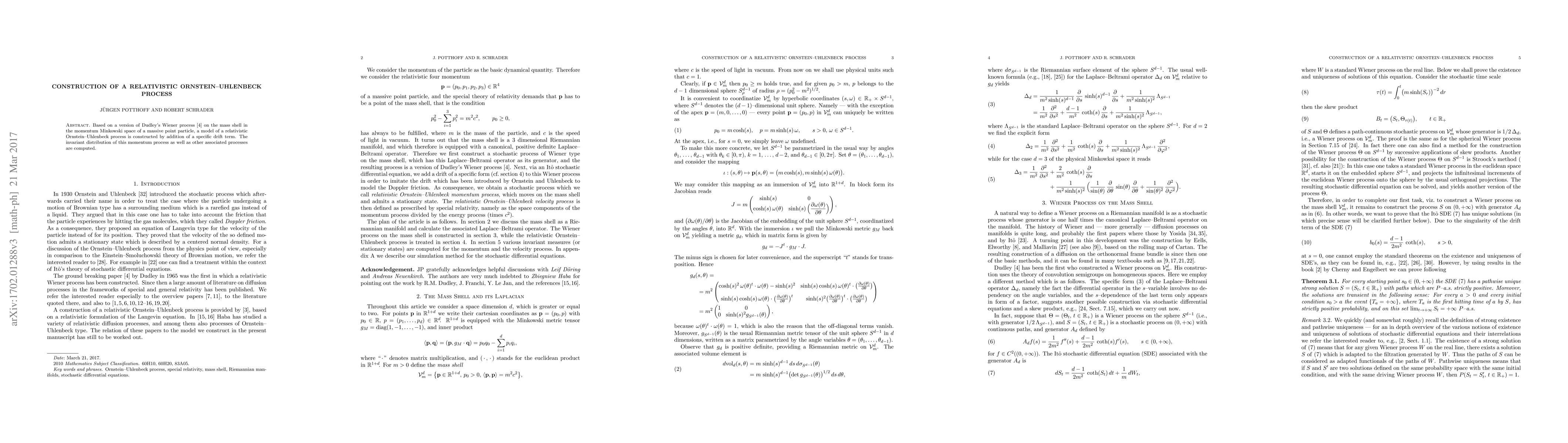 Based on a version of Dudley's Wiener process on the mass shell in the momentum Minkowski space of a massive point particle, a model of a relativistic Ornstein--Uhlenbeck process is constructed by addition of a specific drift term. The invariant distribution of this momentum process as well as other associated processes are computed.