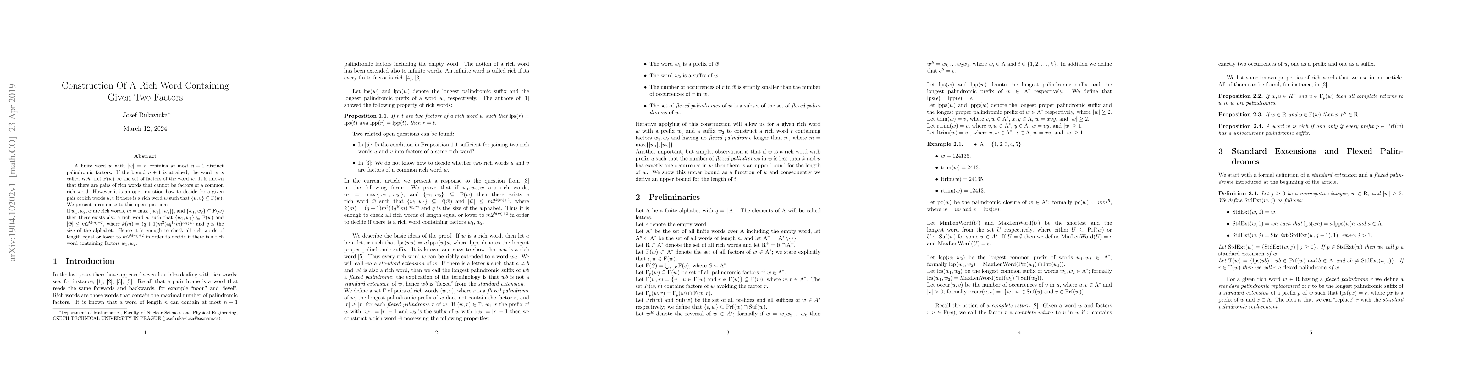 A finite word $w$ with $\vert w\vert=n$ contains at most $n+1$ distinct palindromic factors. If the bound $n+1$ is attained, the word $w$ is called \emph{rich}. Let $\Factor(w)$ be the set of factors of the word $w$. It is known that there are pairs of rich words that cannot be factors of a common rich word. However it is an open question how to decide for a given pair of rich words $u,v$ if there is a rich word $w$ such that $\{u,v\}\subseteq \Factor(w)$. We present a response to this open question:\\ If $w_1, w_2,w$ are rich words, $m=\max{\{\vert w_1\vert,\vert w_2\vert\}}$, and $\{w_1,w_2\}\subseteq \Factor(w)$ then there exists also a rich word $\bar w$ such that $\{w_1,w_2\}\subseteq \Factor(\bar w)$ and $\vert \bar w\vert\leq m2^{k(m)+2}$, where $k(m)=(q+1)m^2(4q^{10}m)^{\log_2{m}}$ and $q$ is the size of the alphabet. Hence it is enough to check all rich words of length equal or lower to $m2^{k(m)+2}$ in order to decide if there is a rich word containing factors $w_1,w_2$.