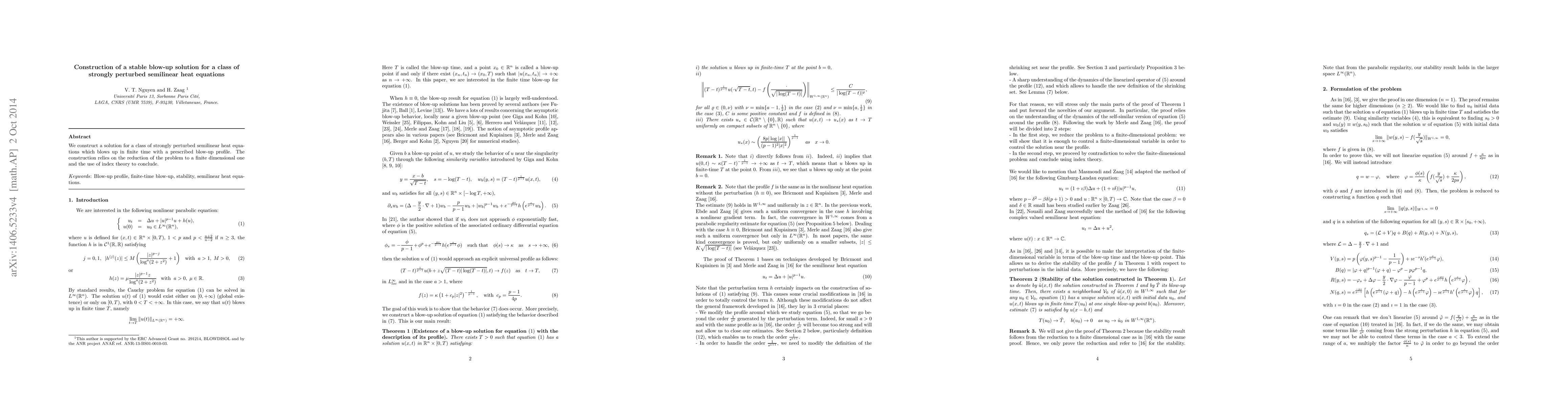 This paper constructs a stable blow-up solution for a class of strongly perturbed semilinear heat equations by reducing the problem to a finite dimensional one and employing index theory to achieve the desired blow-up profile in finite time.