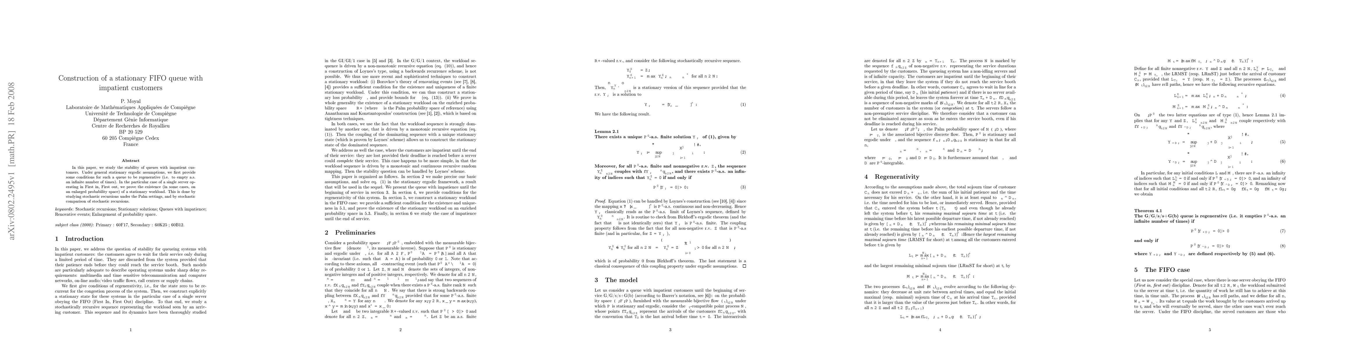 This paper investigates the stability of queues with impatient customers under stationary ergodic conditions, proving regenerative properties and the existence of a stationary workload for a single-server FIFO queue through stochastic recursions and comparison techniques.