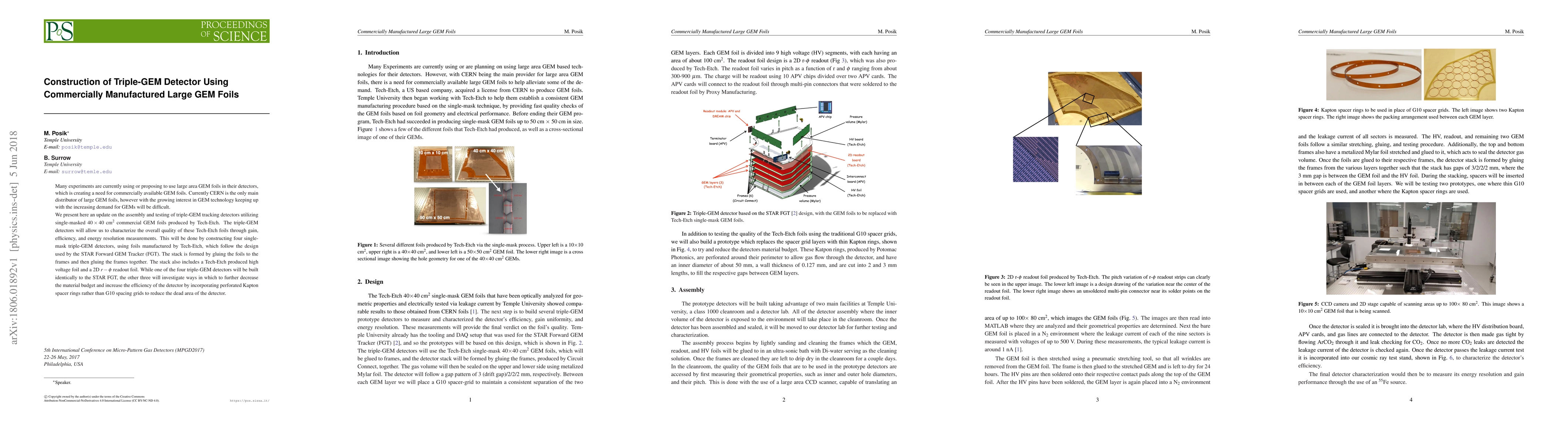 Many experiments are currently using or proposing to use large area GEM foils in their detectors, which is creating a need for commercially available GEM foils. Currently CERN is the only main distributor of large GEM foils, however with the growing interest in GEM technology keeping up with the increasing demand for GEMs will be difficult. We present here an update on the assembly and testing of triple-GEM tracking detectors utilizing single-masked $40 \times 40$ cm$^2$ commercial GEM foils produced by Tech-Etch. The triple-GEM detectors will allow us to characterize the overall quality of these Tech-Etch foils through gain, efficiency, and energy resolution measurements. This will be done by constructing four single-mask triple-GEM detectors, using foils manufactured by Tech-Etch, which follow the design used by the STAR Forward GEM Tracker (FGT). The stack is formed by gluing the foils to the frames and then gluing the frames together. The stack also includes a Tech-Etch produced high voltage foil and a 2D $r-\phi$ readout foil. While one of the four triple-GEM detectors will be built identically to the STAR FGT, the other three will investigate ways in which to further decrease the material budget and increase the efficiency of the detector by incorporating perforated Kapton spacer rings rather than G10 spacing grids to reduce the dead area of the detector.