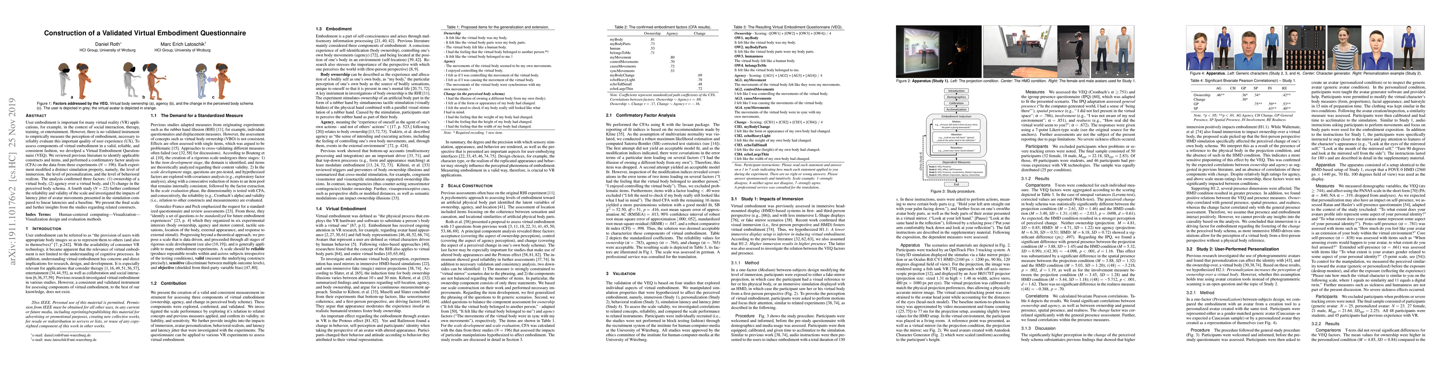 The paper presents a newly developed Virtual Embodiment Questionnaire (VEQ) to measure the perception of embodiment in virtual reality applications, validated through confirmatory factor analysis across three experiments. The VEQ identifies three key factors: ownership, agency, and body schema change, with further validation in a fourth study assessing the impact of latency jitter on embodiment.