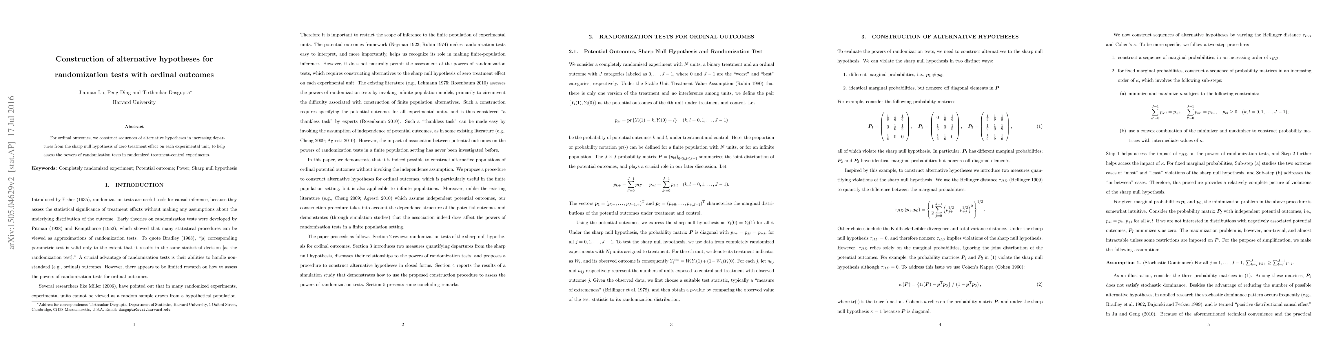 Summary: This research develops sequences of alternative hypotheses for randomization tests to evaluate powers in experiments with ordinal outcomes, moving progressively away from the null hypothesis of no treatment effect. The goal is to better assess the effectiveness of randomization tests in treatment-control studies.
