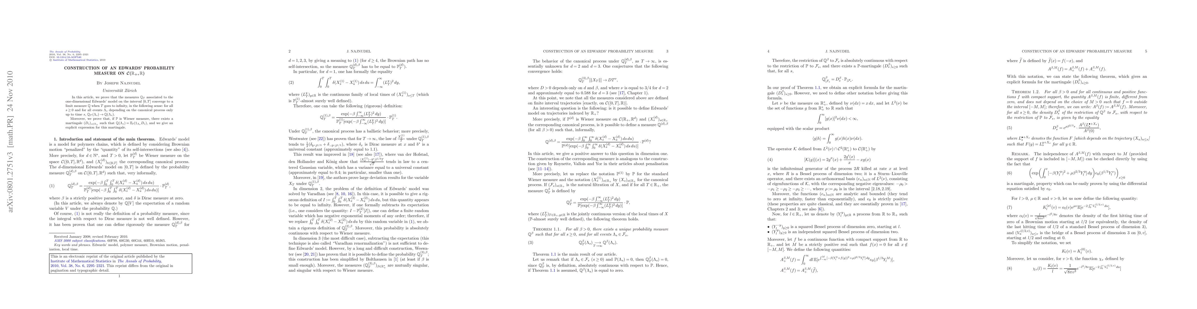 In this article, we prove that the measures $\mathbb{Q}_T$ associated to the one-dimensional Edwards' model on the interval $[0,T]$ converge to a limit measure $\mathbb{Q}$ when $T$ goes to infinity, in the following sense: for all $s\geq0$ and for all events $\Lambda_s$ depending on the canonical process only up to time $s$, $\mathbb{Q}_T(\Lambda_s)\rightarrow\mathbb{Q}(\Lambda_s)$. Moreover, we prove that, if $\mathbb{P}$ is Wiener measure, there exists a martingale $(D_s)_{s\in\mathbb{R}_+}$ such that $\mathbb{Q}(\Lambda_s) =\mathbb{E}_{\mathbb{P}}(\mathbh{1}_{\Lambda_s}D_s)$, and we give an explicit expression for this martingale.