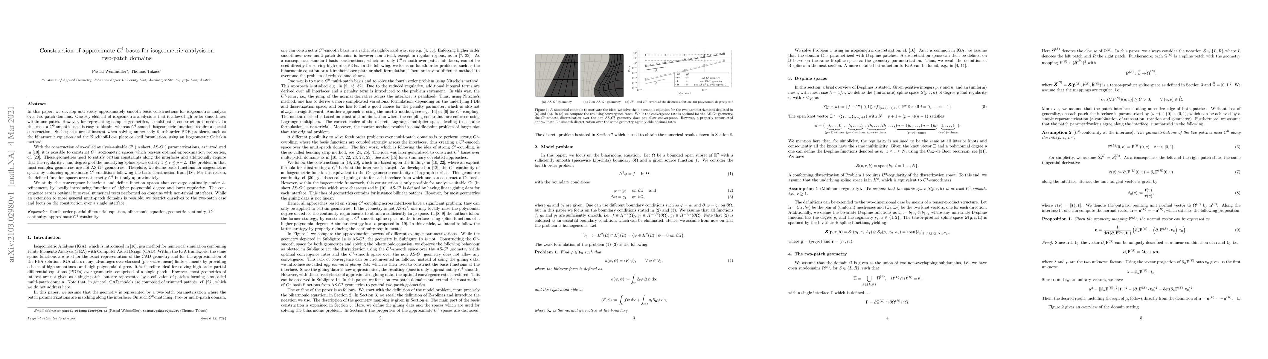 This paper develops approximate $C^1$ basis constructions for isogeometric analysis on two-patch domains, aiming to optimize approximation properties for fourth-order PDE problems. It introduces analysis-suitable $G^1$ parametrizations and locally refines basis functions for optimal convergence under $h$-refinement.