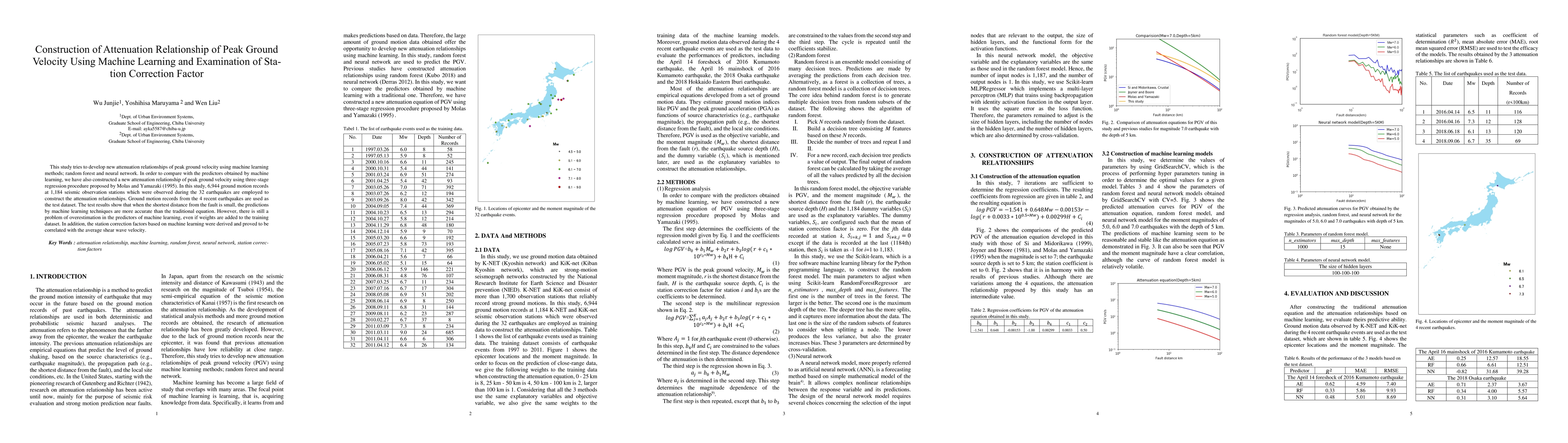This study tries to develop new attenuation relationships of peak ground velocity using machine learning methods; random forest and neural network. In order to compare with the predictors obtained by machine learning, we have also constructed a new attenuation relationship of peak ground velocity using three-stage regression procedure proposed by Molas and Yamazaki (1995). In this study, 6,944 ground motion records at 1,184 seismic observation stations which were observed during the 32 earthquakes are employed to construct the attenuation relationships. Ground motion records from the 4 recent earthquakes are used as the test dataset. The test results show that when the shortest distance from the fault is small, the predictions by machine learning techniques are more accurate than the traditional equation. However, there is still a problem of overestimation in the predictors of machine learning, even if weights are added to the training dataset. In addition, the station correction factors based on machine learning were derived and proved to be correlated with the average shear wave velocity.