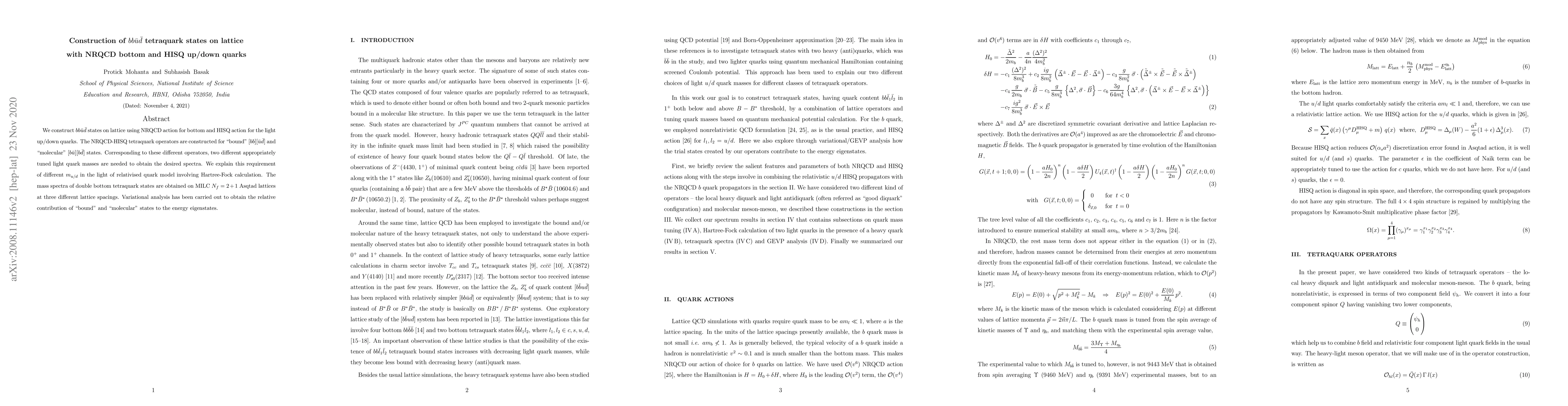 This paper constructs $bb\bar{u}\bar{d}$ tetraquark states using NRQCD for bottom quarks and HISQ for light quarks on lattice QCD. It identifies both "bound" and "molecular" tetraquark states and explains the need for different light quark masses through a relativised quark model.