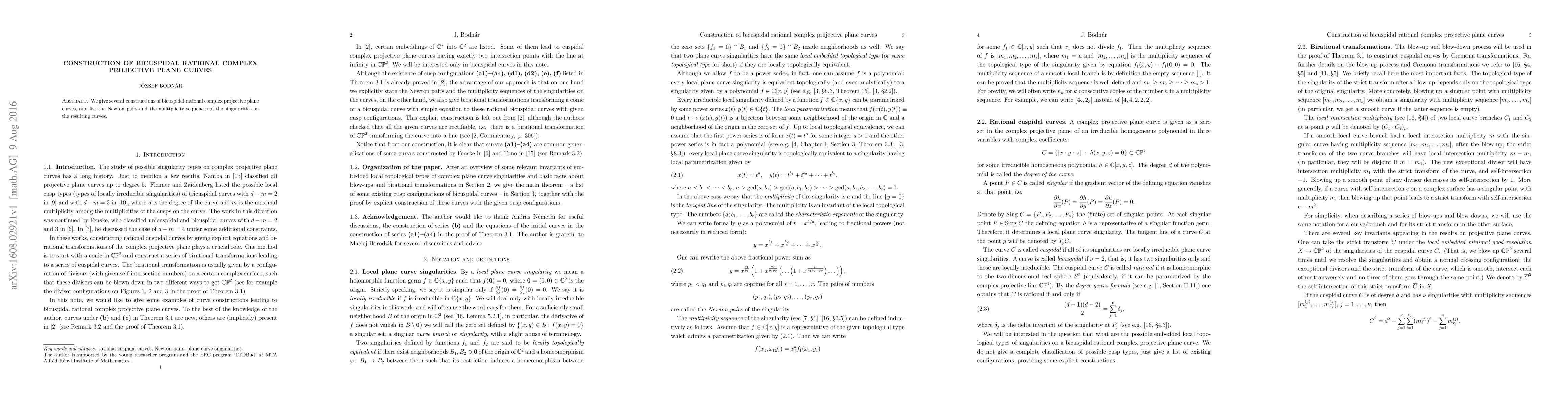 The paper provides new constructions of bicuspidal rational complex projective plane curves with specified cusp configurations, along with explicit Newton pairs and multiplicity sequences of their singularities.