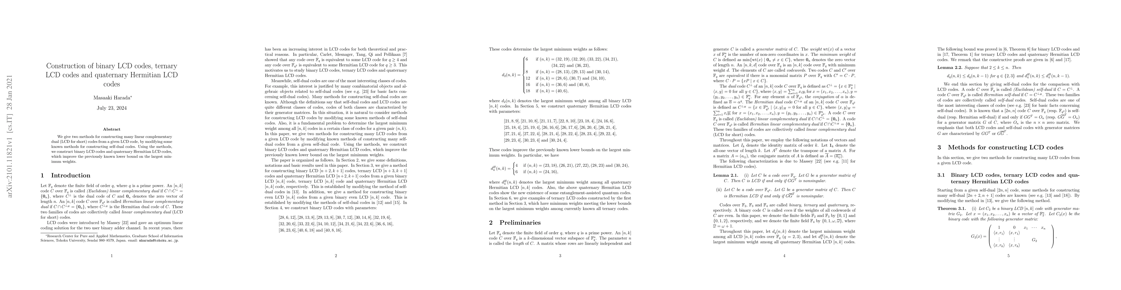 Two methods are presented to construct binary and quaternary LCD codes, improving previous minimum weight bounds. These methods modify known techniques for constructing self-dual codes to generate ternary and quaternary Hermitian LCD codes.