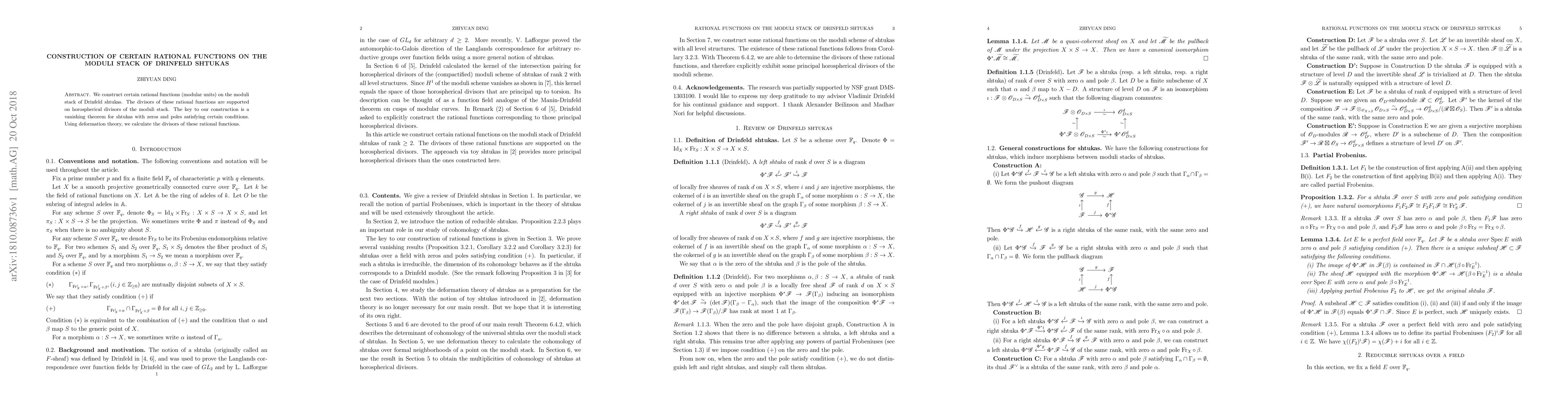This paper constructs rational functions (modular units) on the moduli stack of Drinfeld shtukas, with their divisors supported on horospherical divisors. The construction leverages a vanishing theorem for shtukas with specific zeros and poles, and uses deformation theory to determine these divisors.