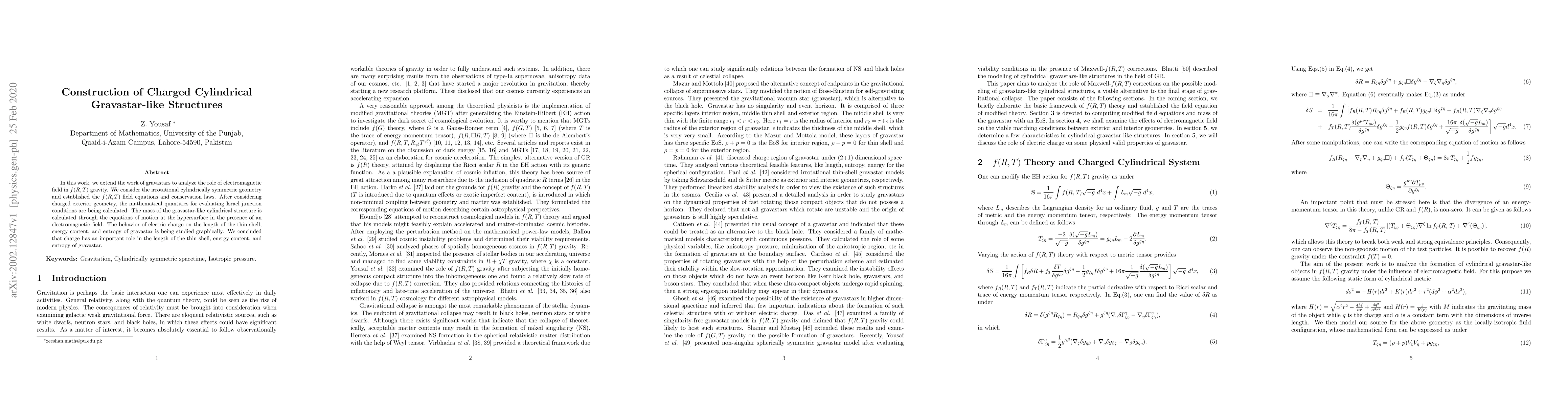 This research extends gravastar models to include electromagnetic fields in f(R,T) gravity, using cylindrical symmetry. It calculates gravastar mass with an electromagnetic field, studies charge impact on shell length, energy, and entropy, concluding that charge significantly influences these gravastar properties.