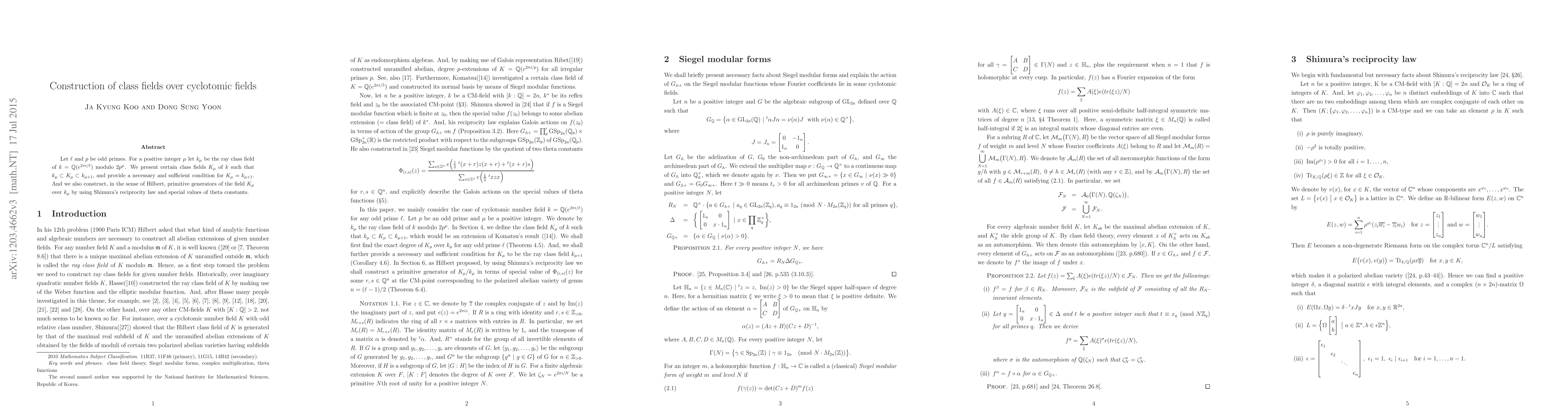 This paper constructs class fields $K_\mu$ of cyclotomic fields $k_\mu$ and determines their degrees over $k_\mu$. It also employs Shimura's reciprocity law and theta constants to find primitive generators for $K_\mu$ over $k_\mu$.