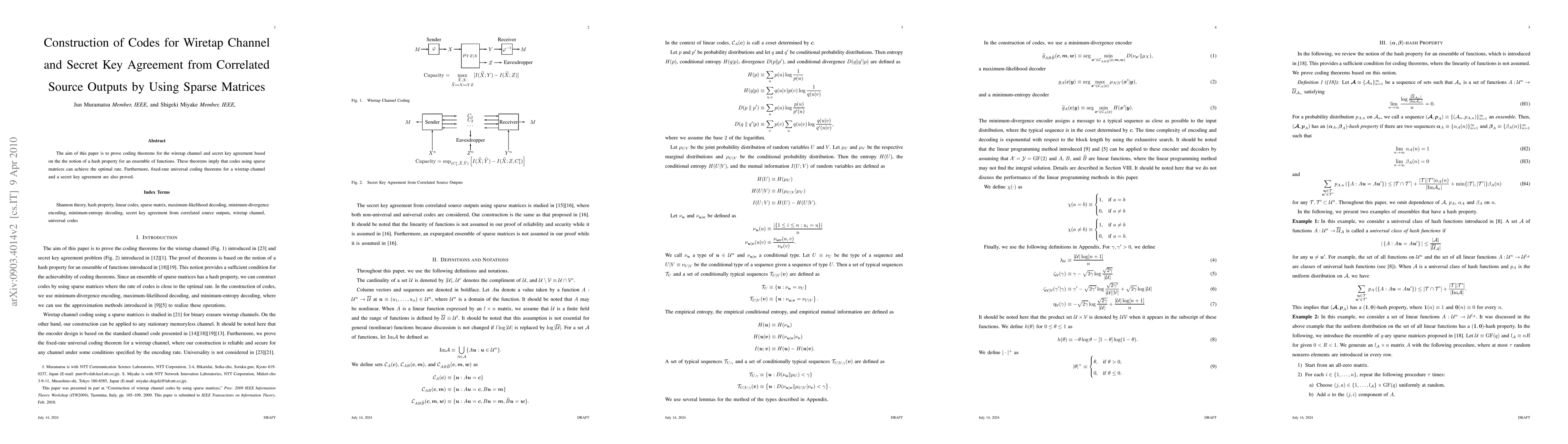 This paper establishes coding theorems for the wiretap channel and secret key agreement using sparse matrices, proving that they can achieve optimal rates. It also presents fixed-rate universal coding theorems for both problems.