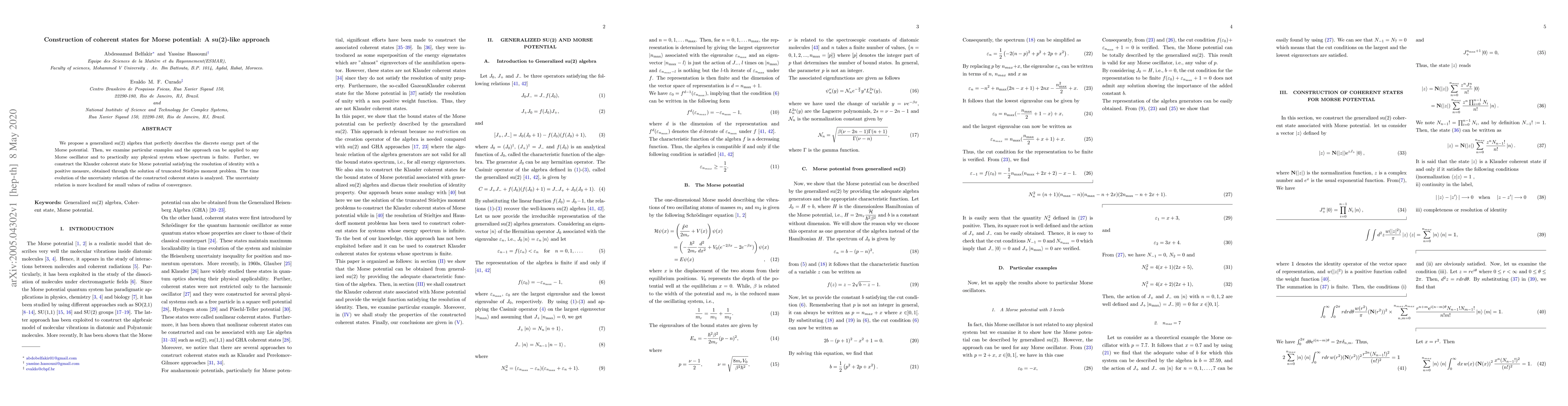 We propose a generalized su(2) algebra that perfectly describes the discrete energy part of the Morse potential. Then, we examine particular examples and the approach can be applied to any Morse oscillator and to practically any physical system whose spectrum is finite. Further, we construct the Klauder coherent state for Morse potential satisfying the resolution of identity with a positive measure, obtained through the solution of truncated Stieltjes moment problem. The time evolution of the uncertainty relation of the constructed coherent states is analyzed. The uncertainty relation is more localized for small values of radius of convergence.