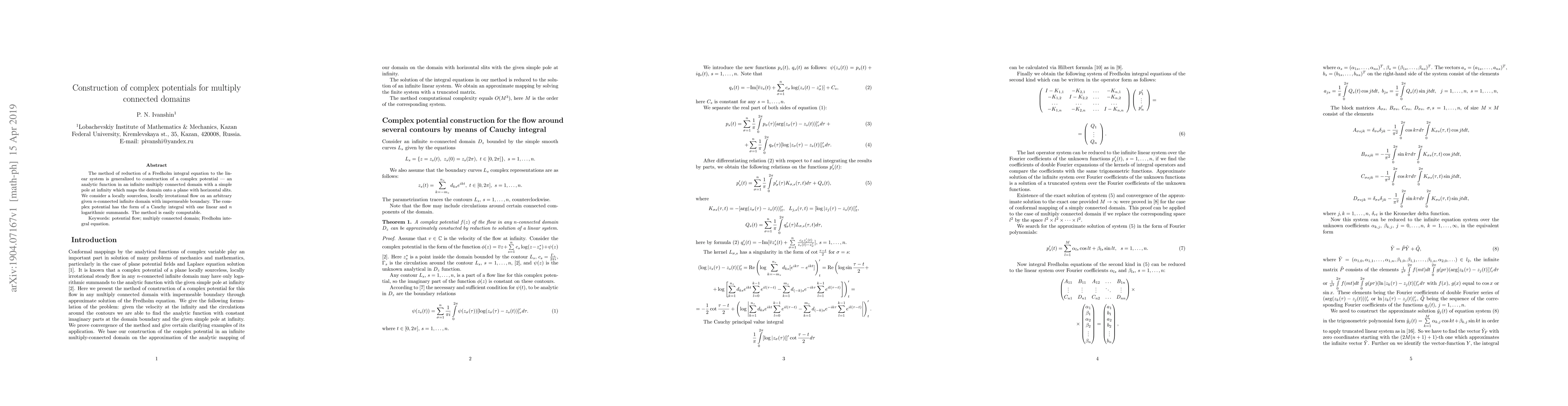 This paper extends a method to construct complex potentials for infinitely connected domains, specifically focusing on flows with simple poles at infinity. The method simplifies the Fredholm integral equation into a linear system, enabling computation of a Cauchy integral with linear and logarithmic terms for any n-connected domain.