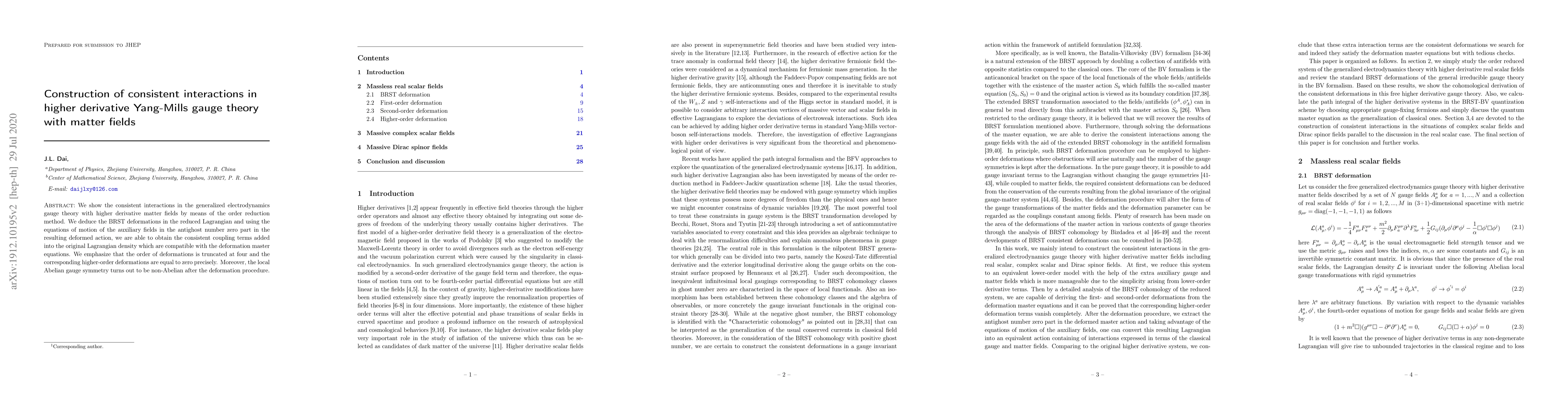 We show the consistent interactions in the generalized electrodynamics gauge theory with higher derivative matter fields by means of the order reduction method. We deduce the BRST deformations in the reduced Lagrangian and using the equations of motion of the auxiliary fields in the antighost number zero part in the resulting deformed action, we are able to obtain the consistent coupling terms added into the original Lagrangian density which are compatible with the deformation master equations. We emphasize that the order of deformations is truncated at four and the corresponding higher-order deformations are equal to zero precisely. Moreover, the local Abelian gauge symmetry turns out to be non-Abelian after the deformation procedure.